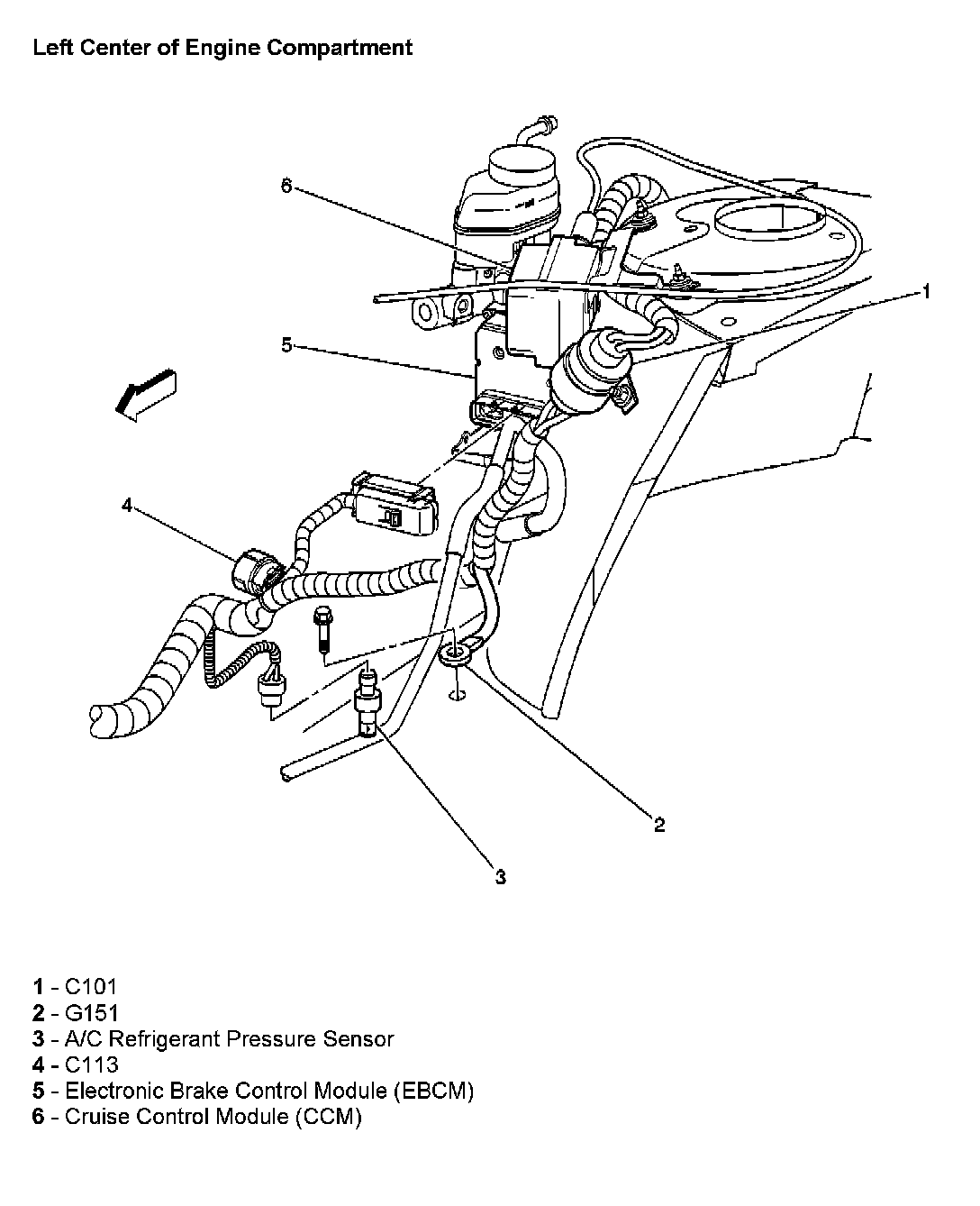 Left Center Of Engine Compartment: