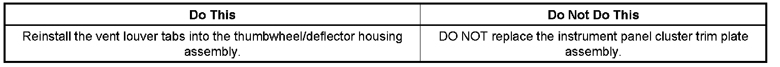 This condition may be caused by the horizontal vent louver tabs becoming disengaged from the retaining holes in the thumbwheel actuator or the deflector housing. This causes the louvers to become inoperative or loose. The louvers are designed to move together in a uniform manner.