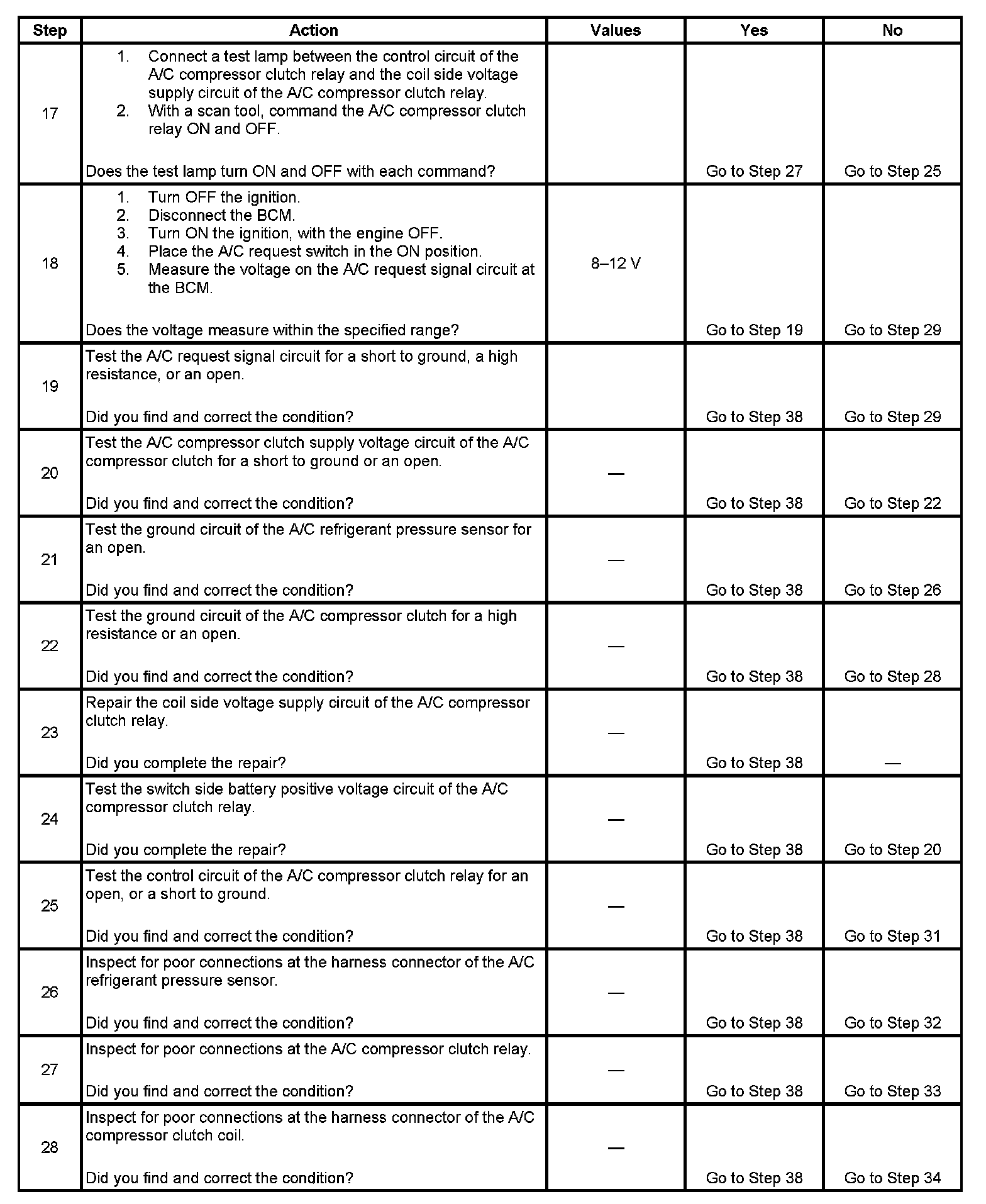 The numbers below refer to the step numbers on the diagnostic table.