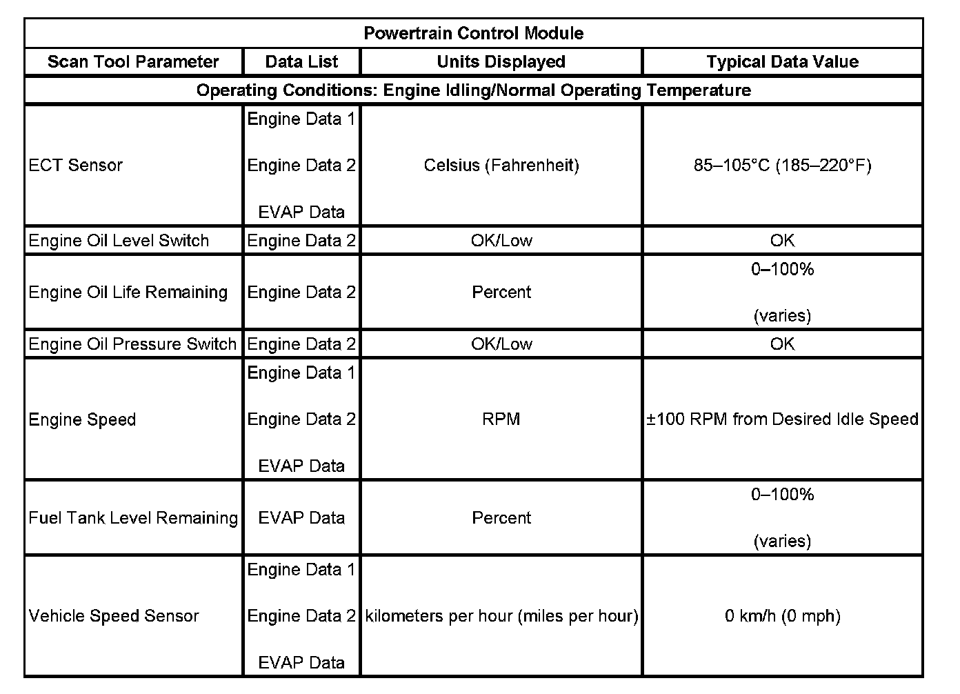 Scan Tool Data List - Powertrain Control Module (PCM)