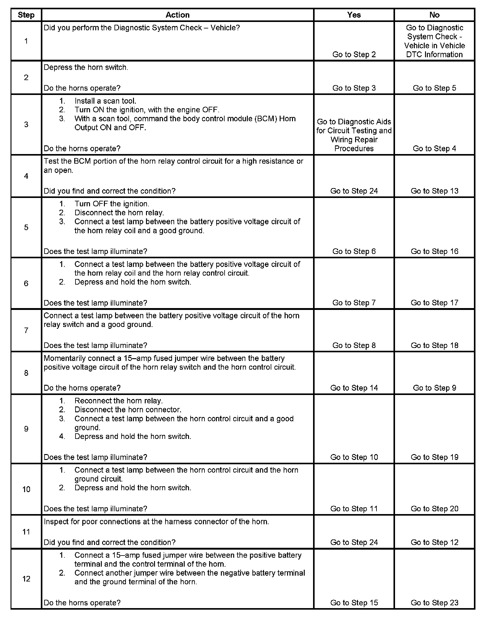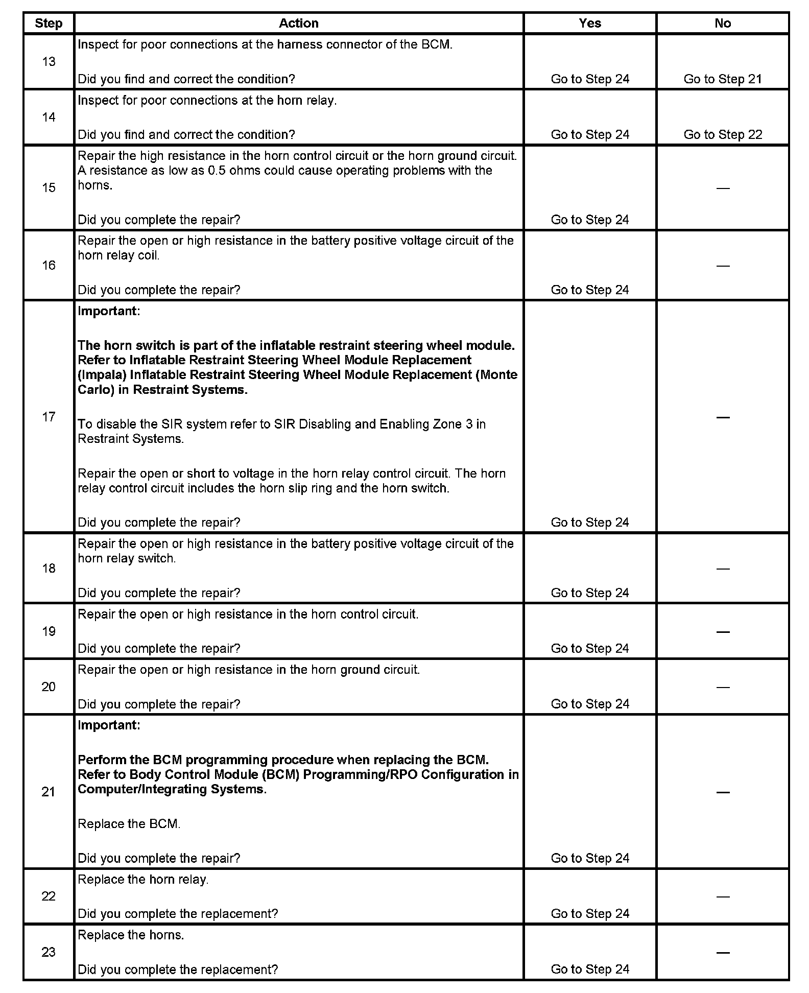 17. The horn relay control circuit includes the horn slip ring and the horn switch. The horn switch is part of the inflatable restraint steering wheel module. The horn slip ring and the horn switch must be tested for a high resistance, an open or a short to voltage when testing the relay control circuit. Refer to Inflatable Restraint Steering Wheel Module Replacement (Impala) Inflatable Restraint Steering Wheel Module Replacement (Monte Carlo) in Restraint Systems.