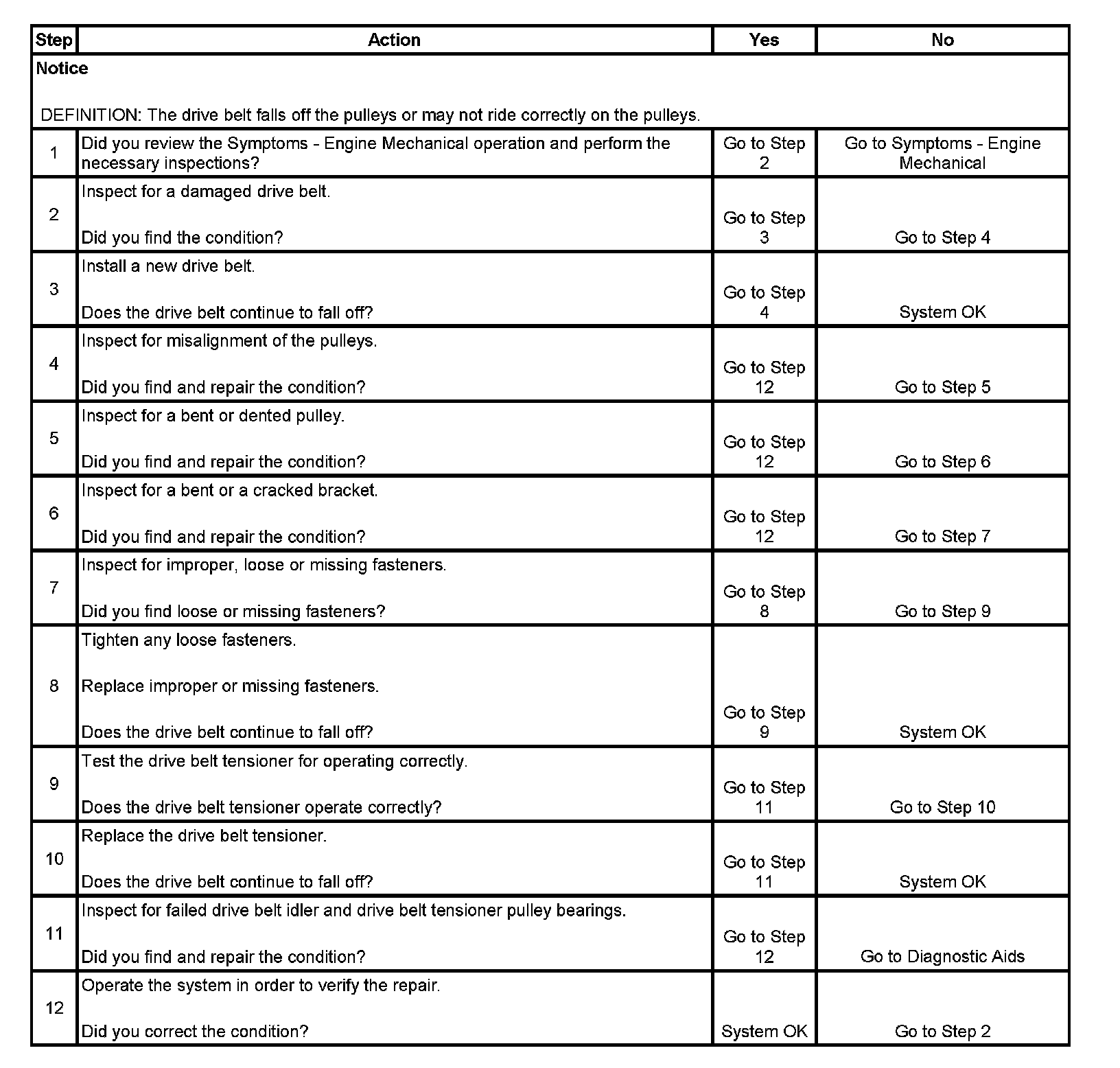 An extra load that is quickly applied on released by an accessory drive component may cause the drive belt to fall off the pulleys. Verify the accessory drive components operate properly.