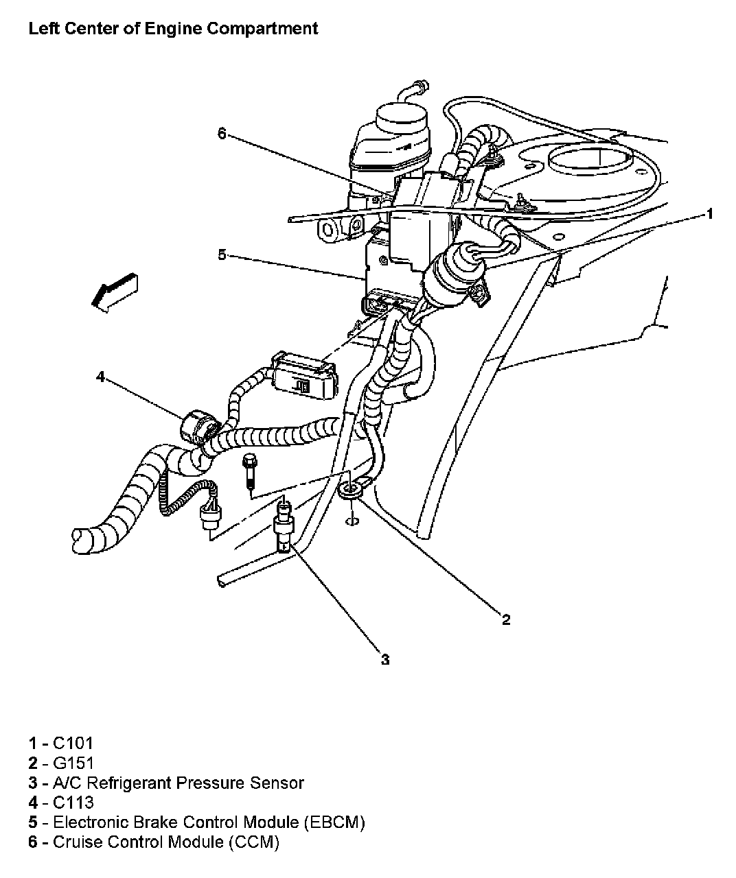 Left Center Of Engine Compartment: