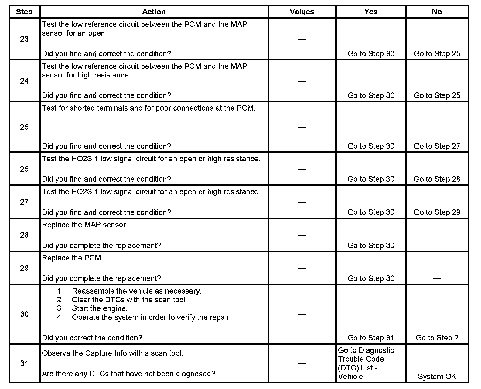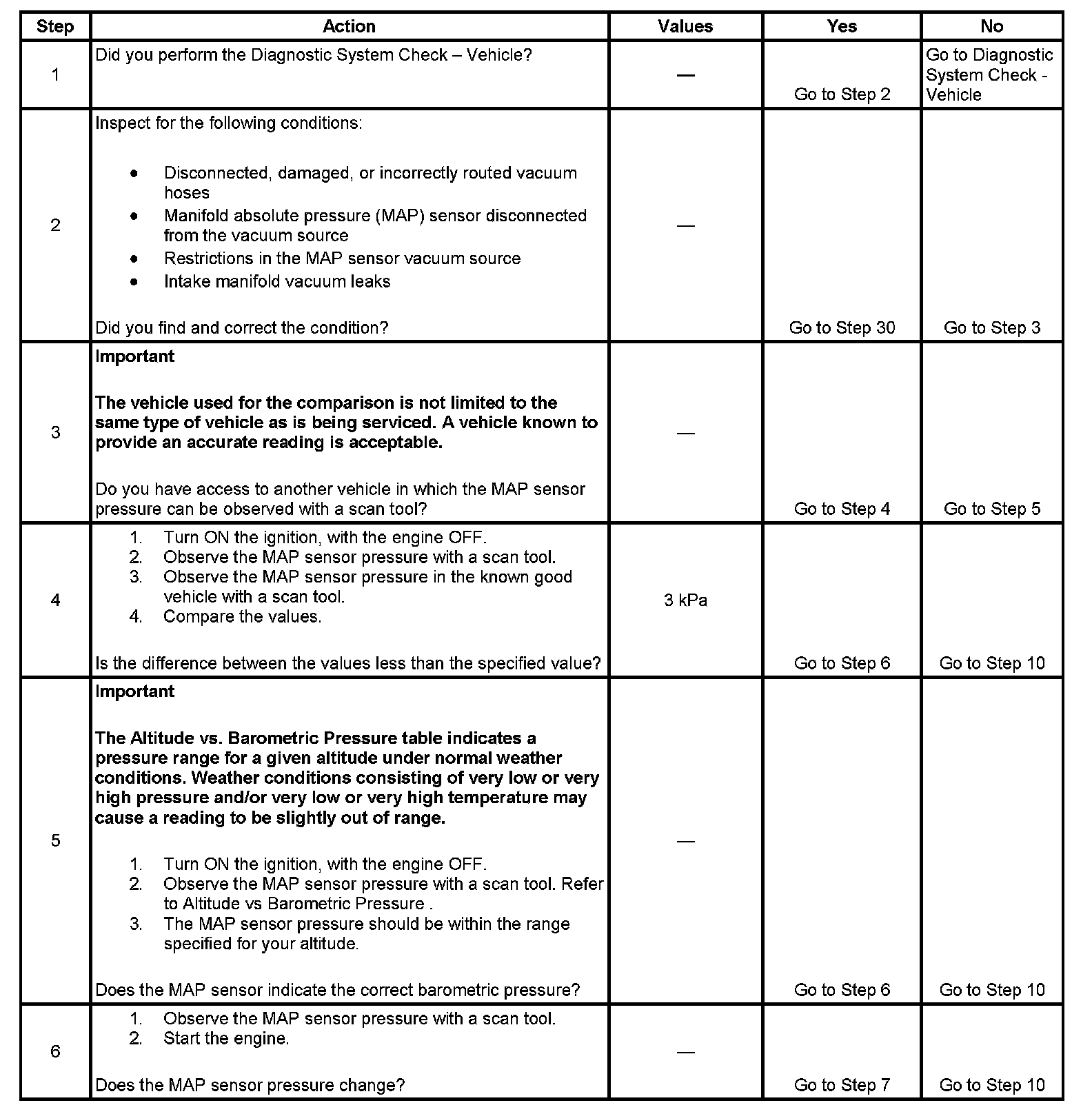 The manifold absolute pressure (MAP) sensor responds to changes in intake manifold pressure which gives an indication of the engine load. The MAP sensor has a 5-volt reference circuit, a low reference circuit, and a signal circuit. The powertrain control module (PCM) supplies 5 volts to the MAP sensor on the 5-volt reference circuit and provides a ground on the low reference circuit. The MAP sensor provides a signal to the PCM on the MAP sensor signal circuit, which is relative to the pressure changes in the manifold. With low MAP, such as during idle or deceleration, the PCM should detect a low MAP sensor signal voltage. With high MAP, such as ignition ON, engine OFF, or wide open throttle (WOT), the PCM should detect a high MAP sensor signal voltage. The MAP sensor is also used in order to calculate the barometric pressure (BARO) when the ignition switch is turned ON, with the engine OFF. The BARO reading may also be updated whenever the engine is operated at WOT. The PCM monitors the MAP sensor signal for voltage outside of the normal range. If the PCM detects a MAP sensor signal voltage that is excessively low, DTC P0107 sets. If the PCM detects a MAP sensor signal voltage that is excessively high, DTC P0108 sets.