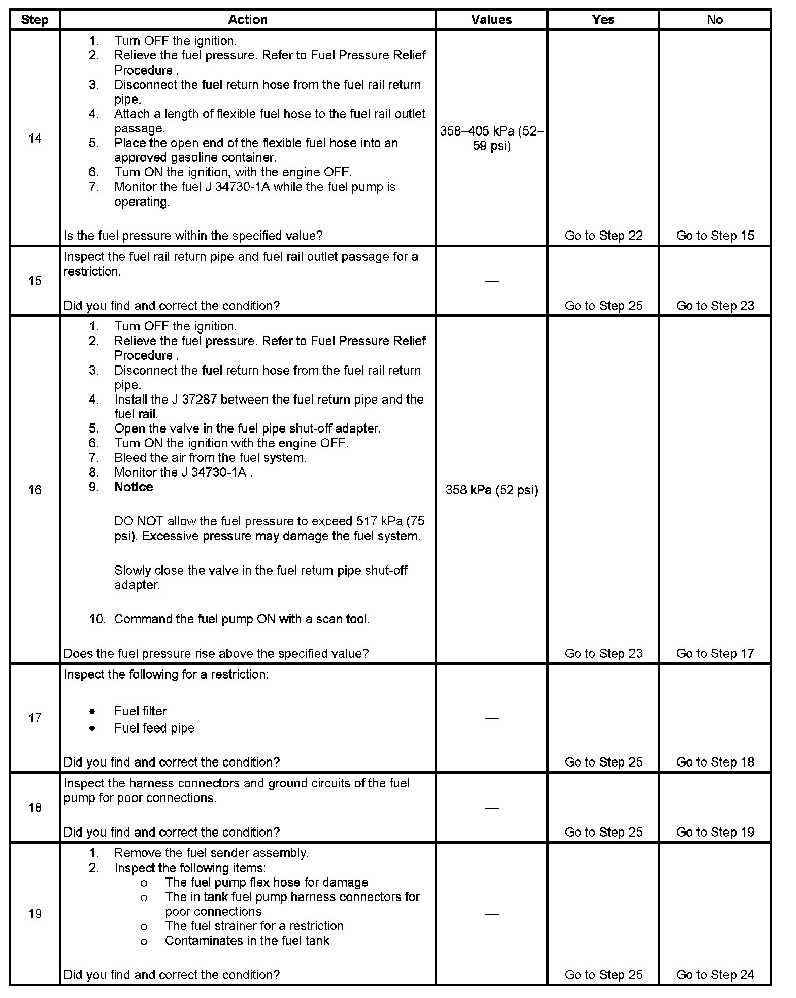 14. This step tests for a restricted fuel return pipe. If the fuel pressure is within the specified values, a restriction in the fuel return pipe is indicated.