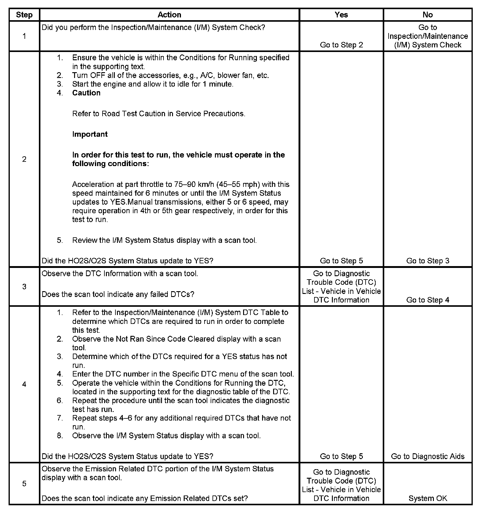 The purpose of this test is to satisfy the enable criteria necessary to execute inspection/maintenance (I/M) readiness diagnostics for the oxygen sensor (O2S, HO2S) system. The test may be used to set the I/M System Status to YES. The I/M System Status display on the scan tool provides an indication of whether the control module has completed the required tests. The I/M System Status does not indicate that the tests have passed or failed. When all of the diagnostics for a specific system have run and passed, the I/M System Status will update to YES. If a test for a specific system has failed, the I/M System Status will update to YES, indicating a determination was made, even if all of the other tests for that system have not run.