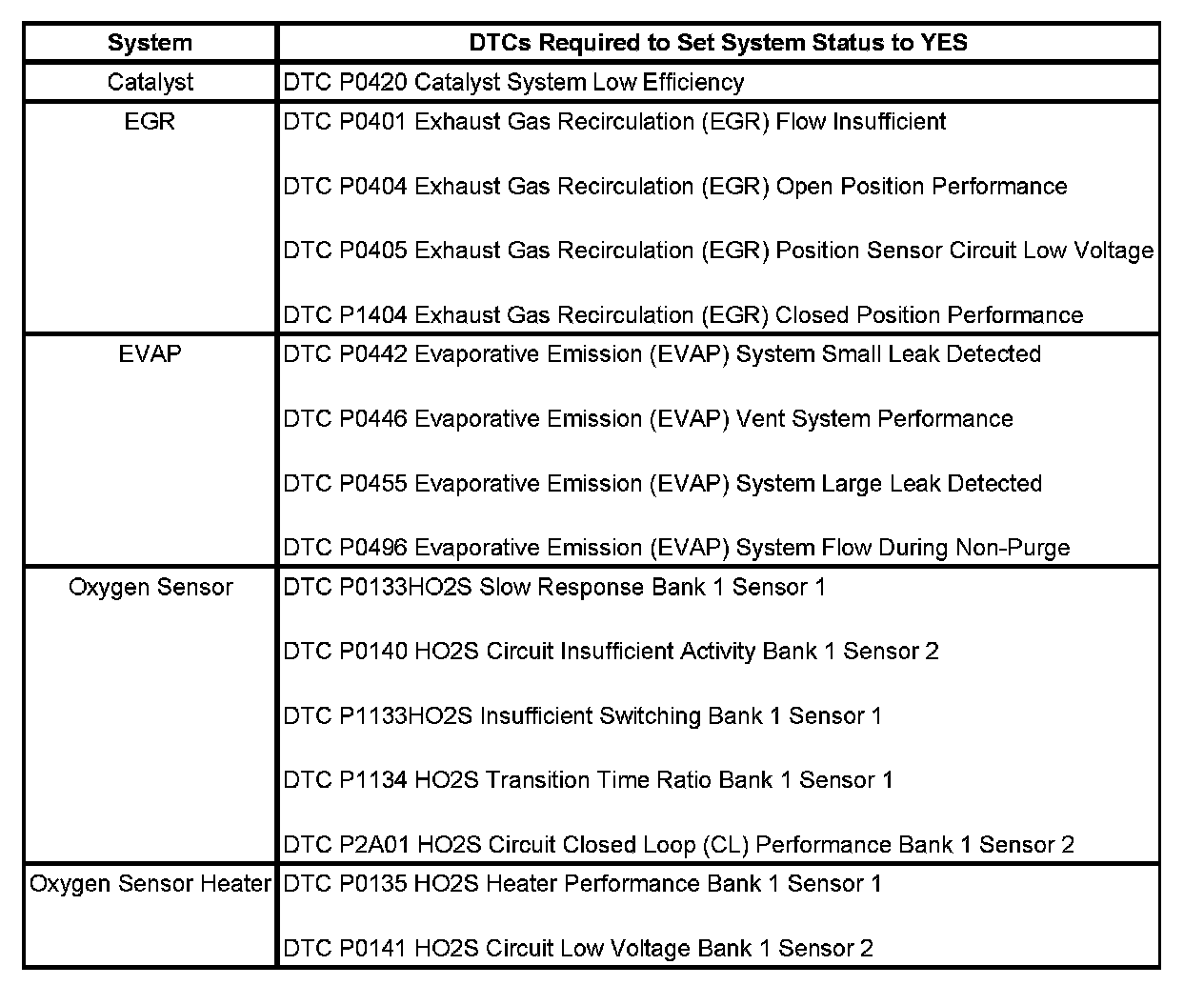 IMPORTANT: Not all vehicles will have every diagnostic trouble code (DTC) listed in each section. For example, a vehicle may have only 2 oxygen sensors or 1 catalyst. Only those DTCs applicable to the vehicle are required to update each System Status to YES. Refer to the appropriate service data to determine which DTCs are supported for each vehicle.