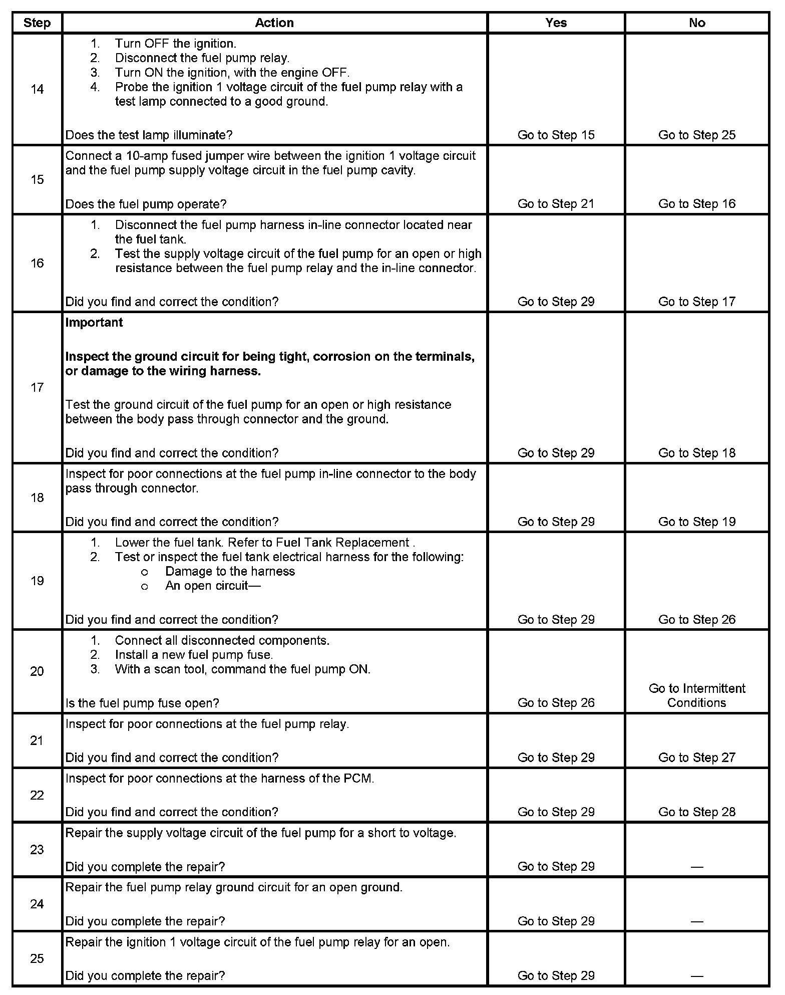 17. This step tests for an open or high resistance in the fuel pump ground circuit.
