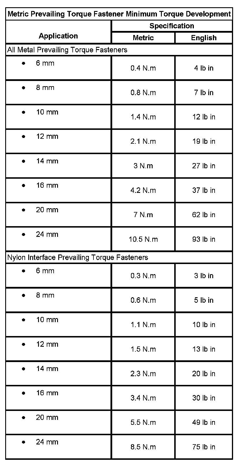 Metric Prevailing Torque Fastener Minimum Torque Development: