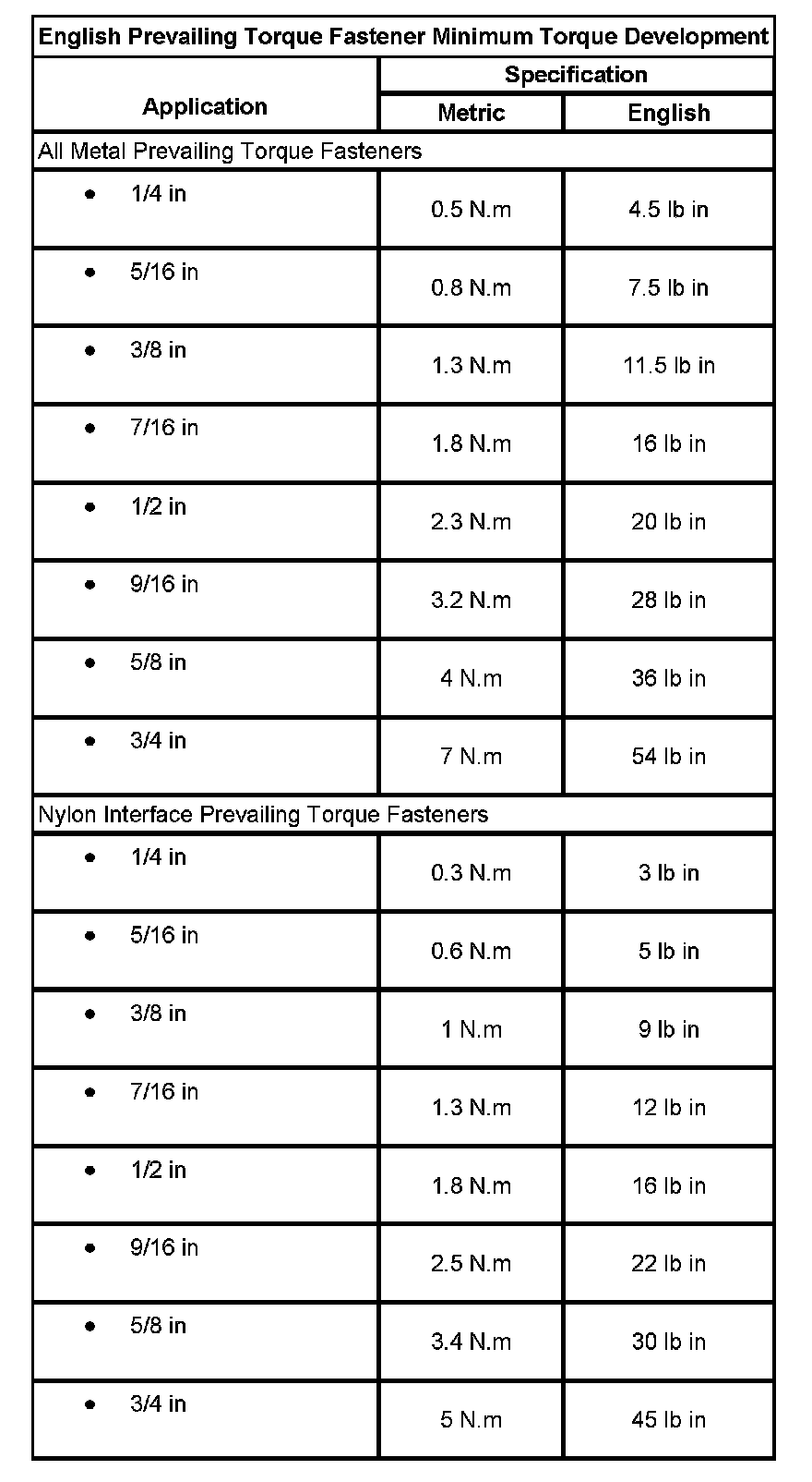 English Prevailing Torque Fastener Minimum Torque Development: