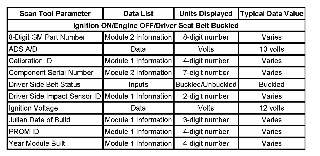 Use the SIR scan tool data list as directed by a diagnostic table or in order to supplement the diagnostic procedures. Begin all of the diagnostic procedures with the Diagnostic System Check - Restraint Systems. Use the SIR scan tool data list after the following is determined: