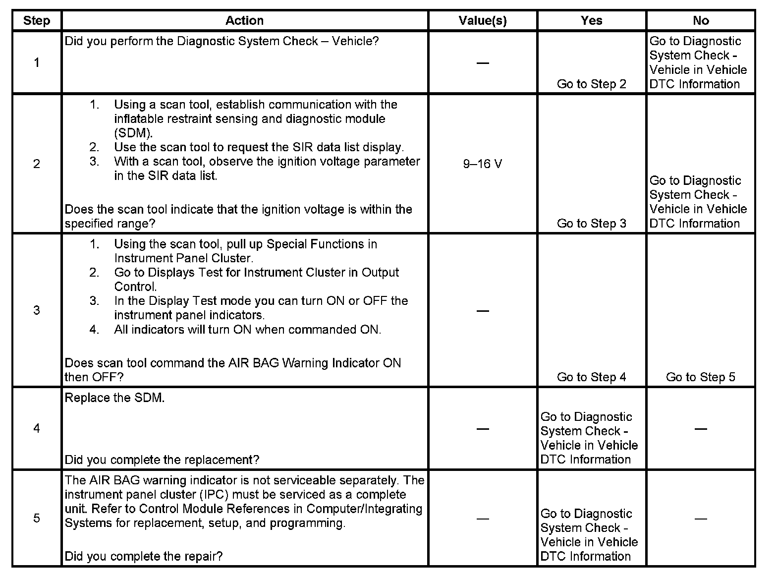 If battery voltage is outside of the normal operating voltage range, 9-16 volts, the AIR BAG warning indicator will come ON solid with no DTCs set.