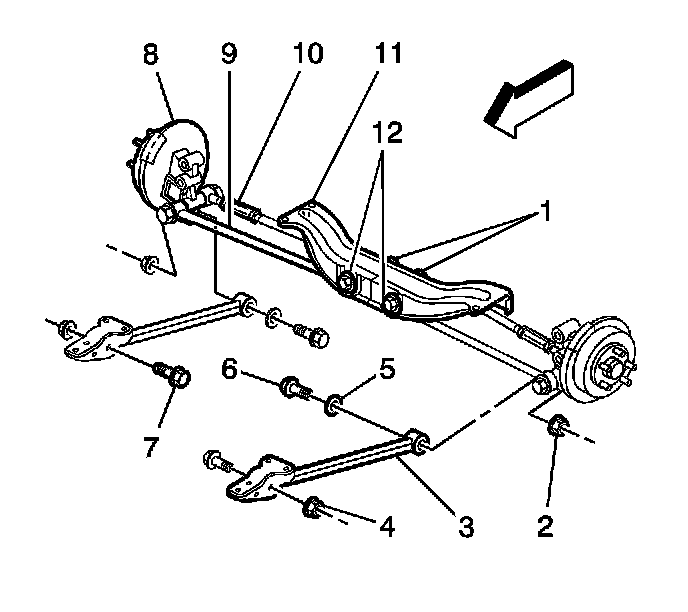 2. Remove the bolt (6) and nu (2) from the trailing arm (3) and the knuckle (8).