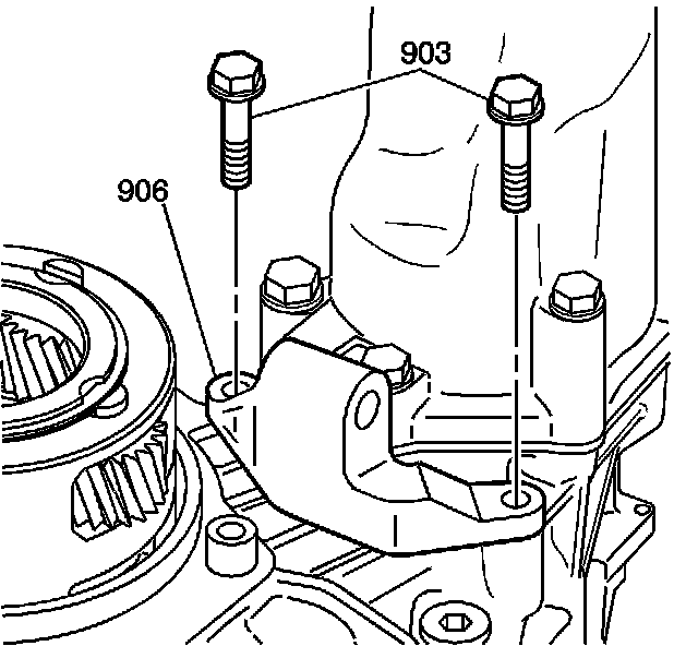 5. Remove the transfer case side brace bolts (903). Remove the side brace (905).