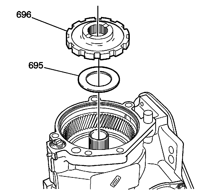 19. Remove the parking gear (696) and the parking gear thrust bearing (695).