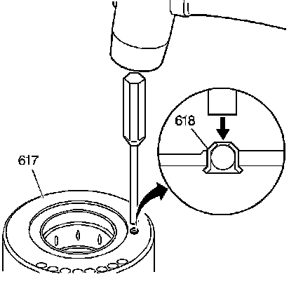 Use a 6.25 mm (1/4 inch) drift and a mallet in order to remove the ball check valve assembly (618) from the second clutch housing (617).