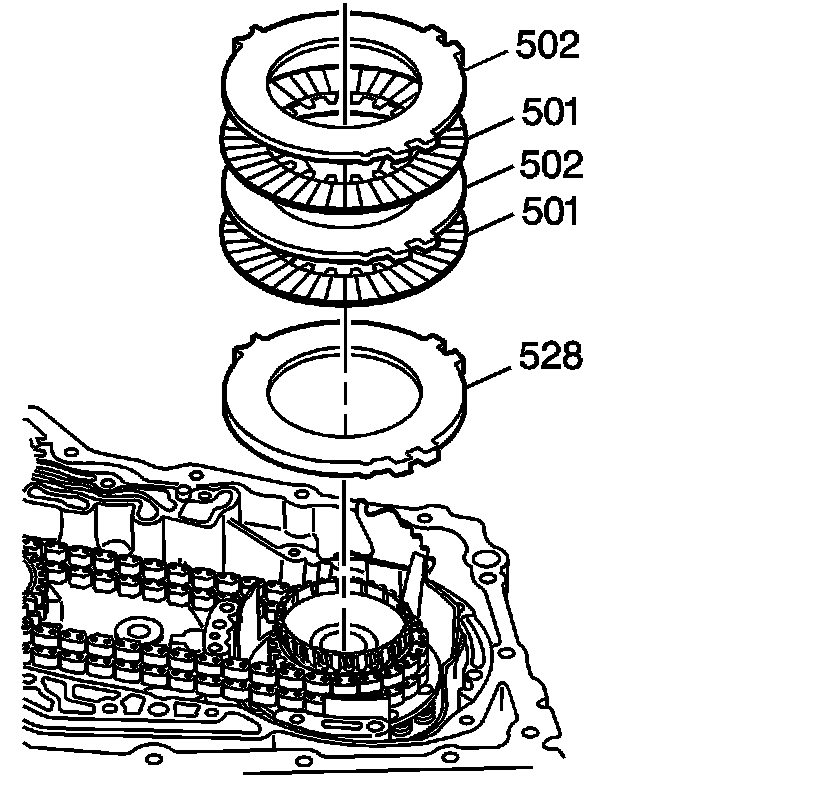 6. Install the remaining fourth clutch plates, starting with a fiber plate assembly (501) and alternating with steel plates (502).
