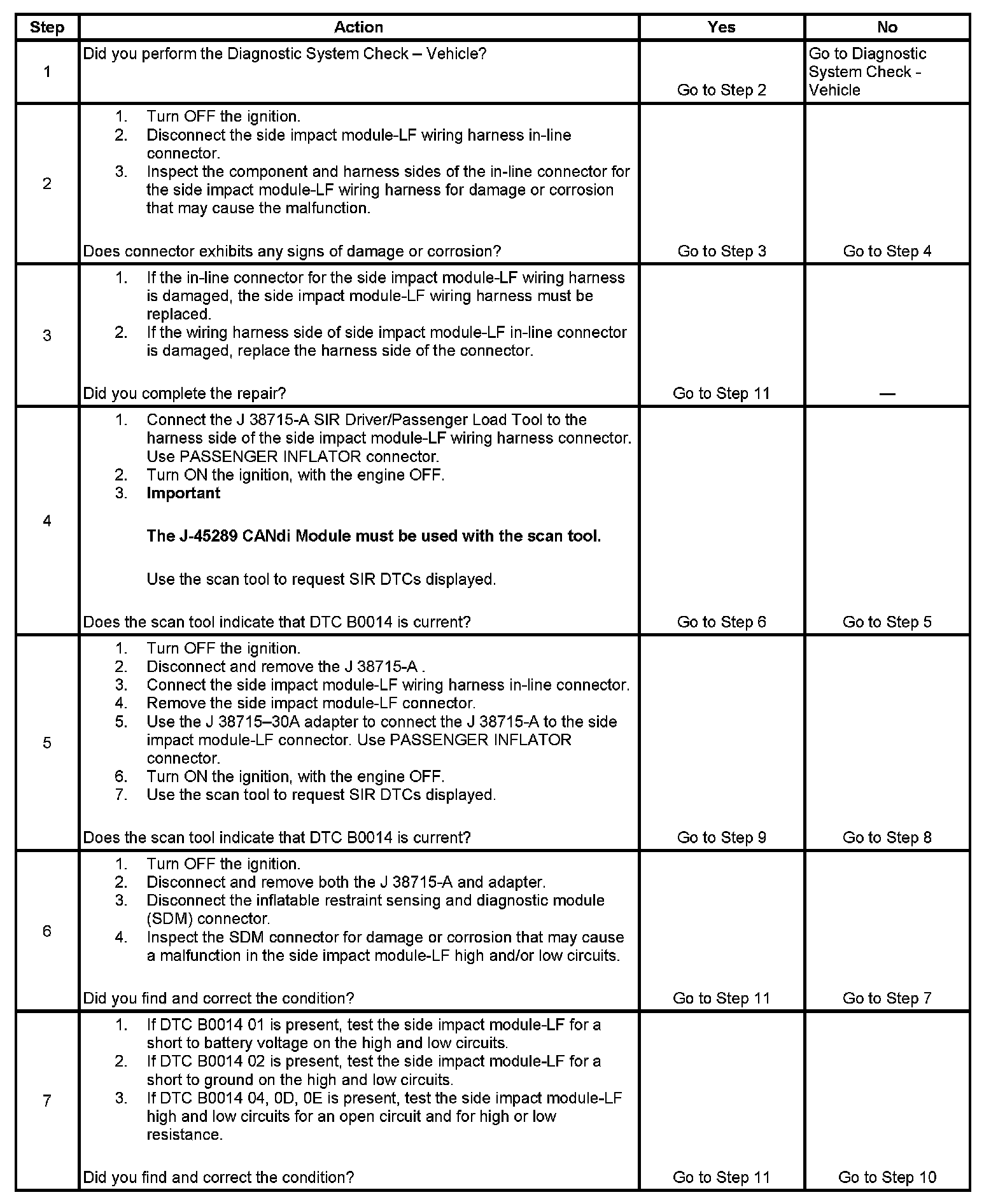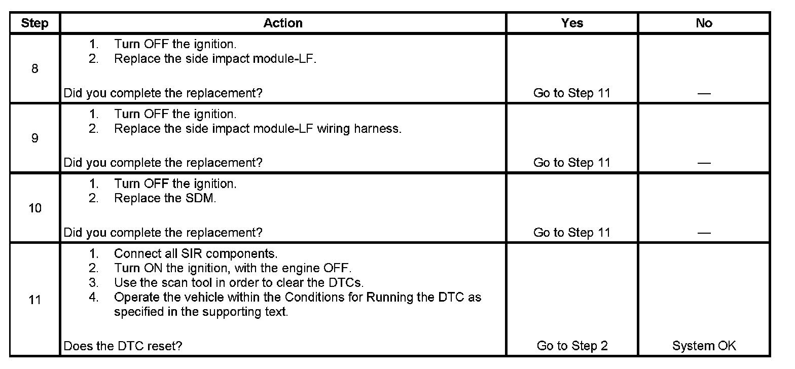 7. Tests to see what DTCs are present. If DTC B0014 01 is present, test the side impact module-LF for a short to battery voltage on the high and low circuits. If DTC B0014 02 is present, test the side impact module-LF for a short to ground on the high and low circuits. If DTC B0014 04, 0D, 0E is present, test the side impact module-LF test the high and low circuits for an open circuit and for high or low resistance.