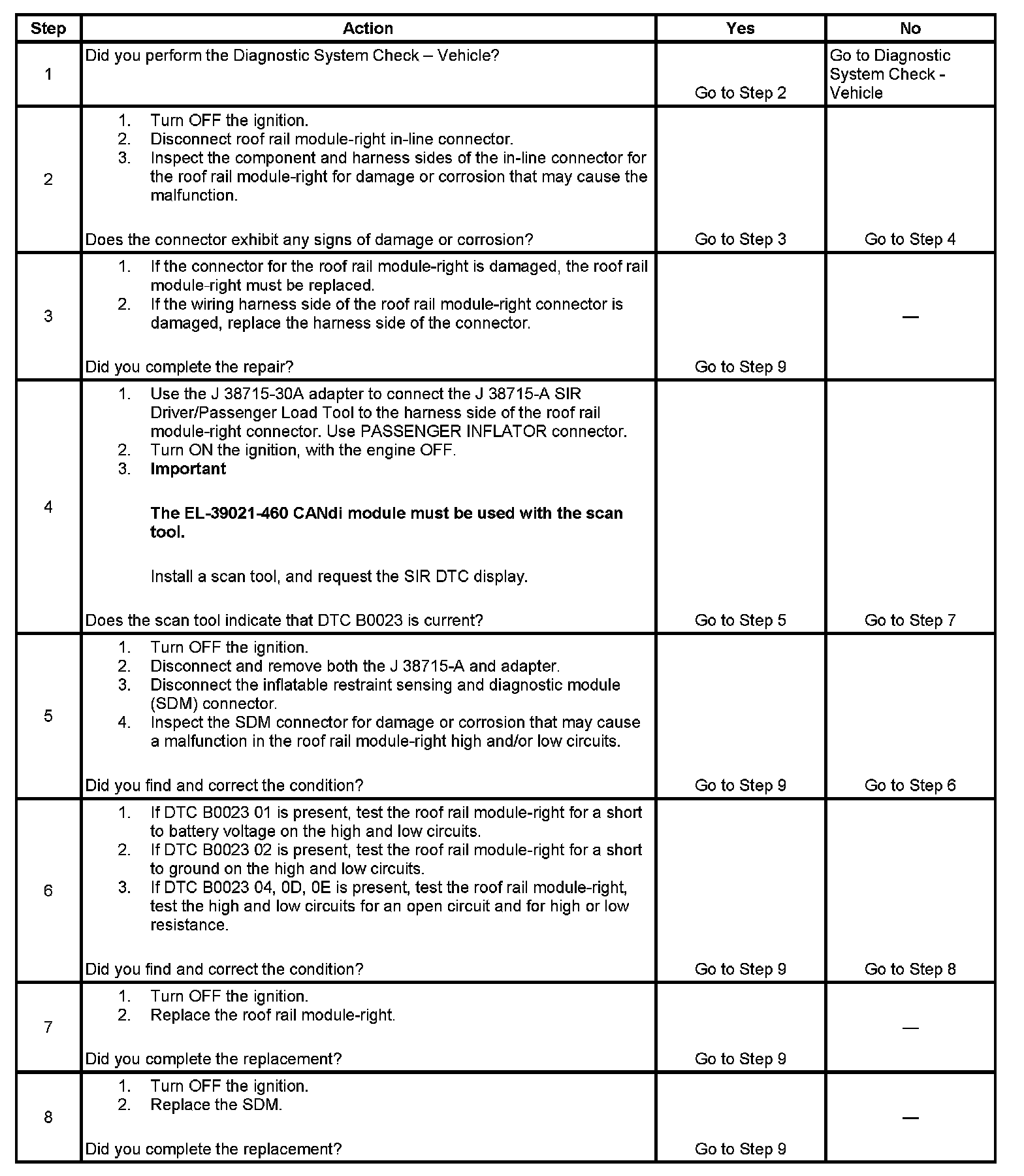 6. This step tests to see what DTCs are present. If DTC B0023 01 is present, test the roof rail module-right for a short to battery voltage on the high and low circuits. If DTC B0023 02 is present, test the roof rail module-right for a short to ground on the high and low circuits. If DTC B0023 04, 0D, 0E is present, test the roof rail module-right test the high and low circuits for an open circuit and for high or low resistance.