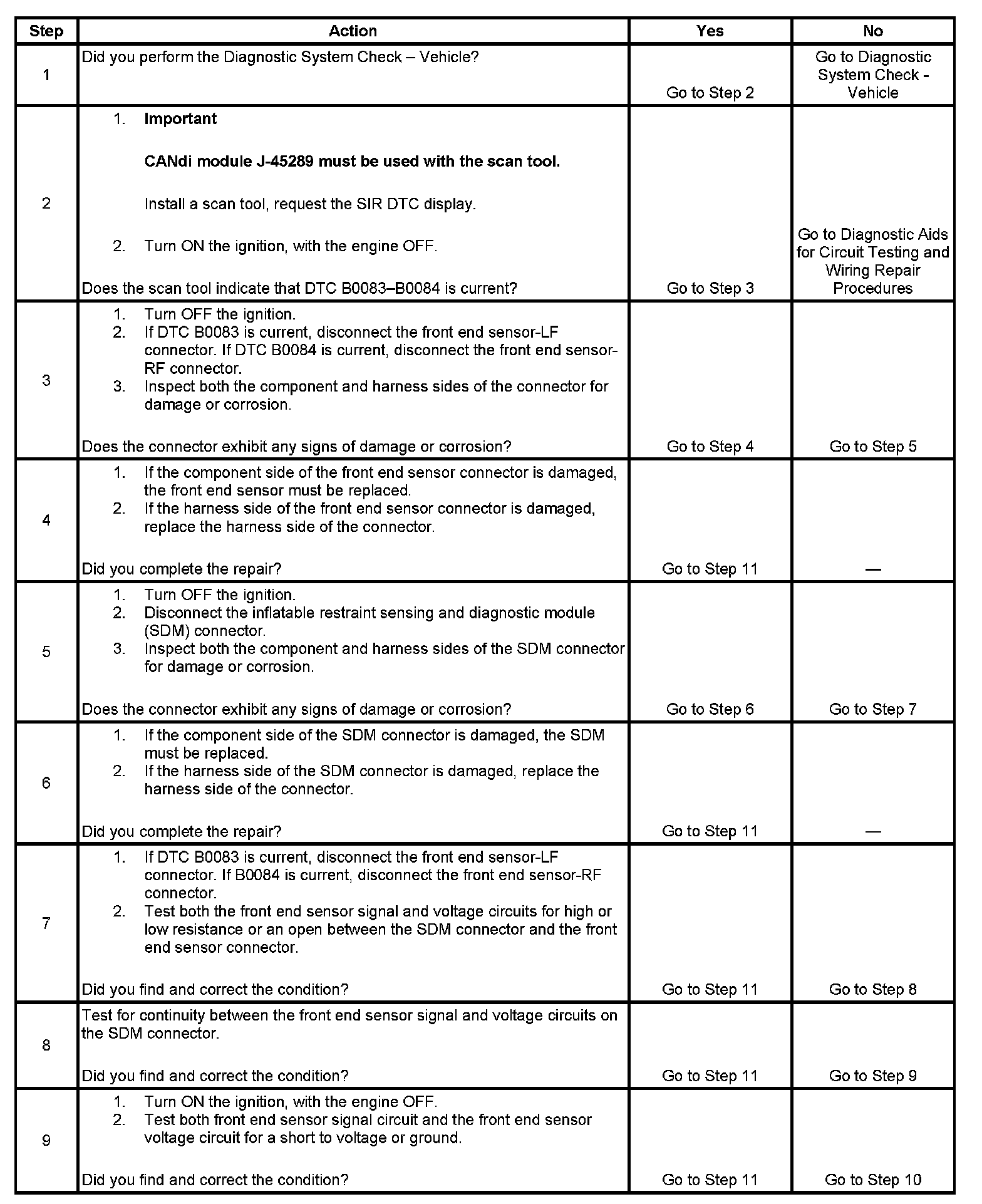 8. Tests between the front end sensor signal and front end sensor voltage circuits for continuity