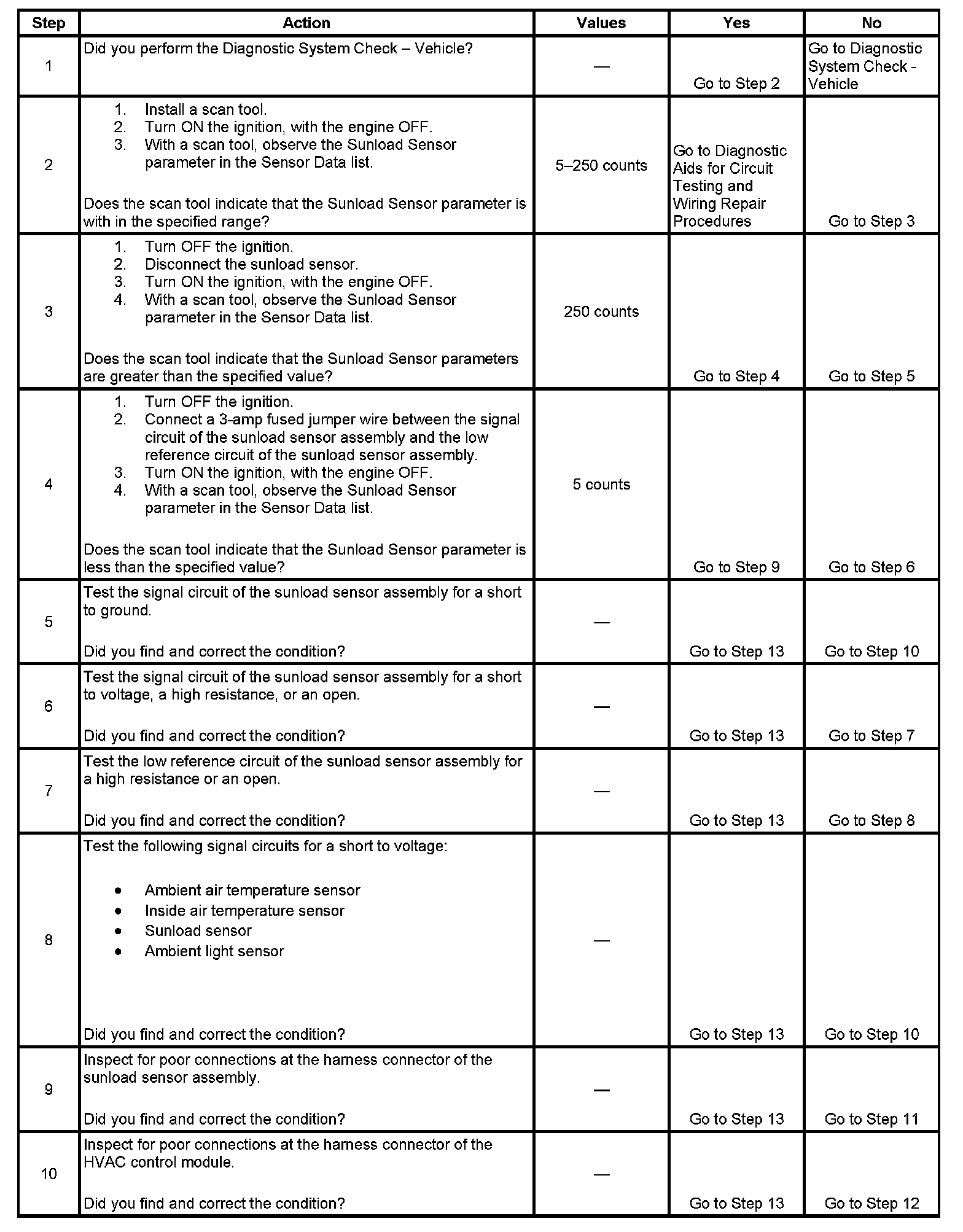 If the DTC sets due to a low voltage condition, the HVAC control module will operate the system as if a maximum sunload condition exists. If the DTC sets due to a high voltage condition, the HVAC control module will operate the system as if a minimum sunload condition exists.