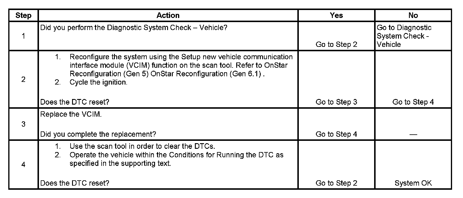 This DTC is set as current in all vehicle communication interface module (VCIM) service parts and has been implemented as a reminder to contact the OnStar(R) Call Center to properly update the customers account once the new module has been installed. This call is initiated automatically after the installation of the replacement VCIM, and the completion of the Setup New VCIM procedure on the scan tool. No external circuits are involved.