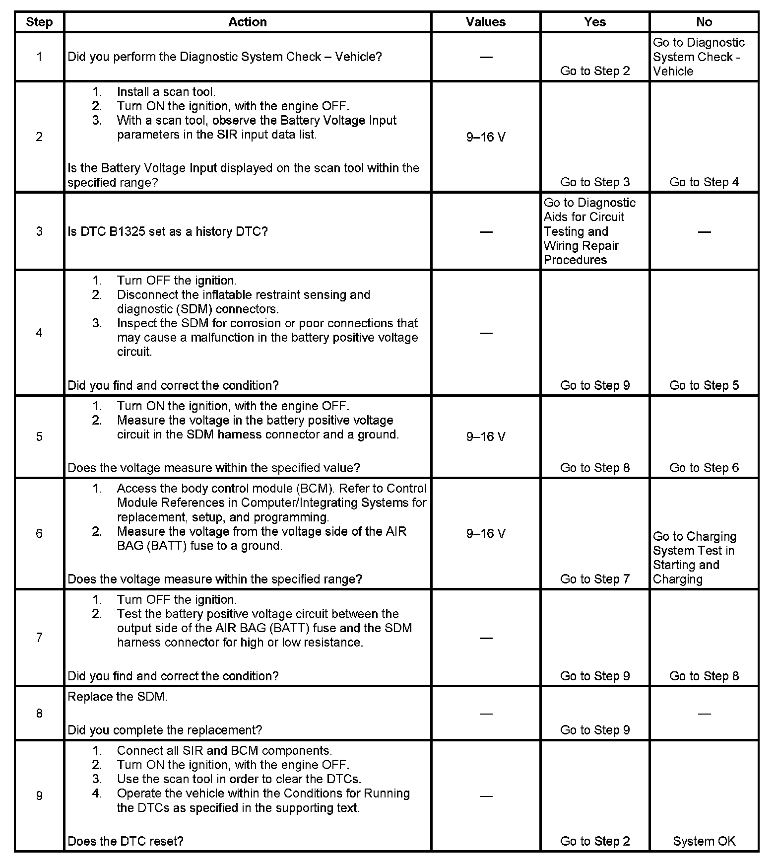 The inflatable restraint sensing and diagnostic module (SDM) monitors the battery positive voltage input from the battery. If the SDM detects this battery positive voltage circuit is above or below the threshold, then DTC B1325 will set.