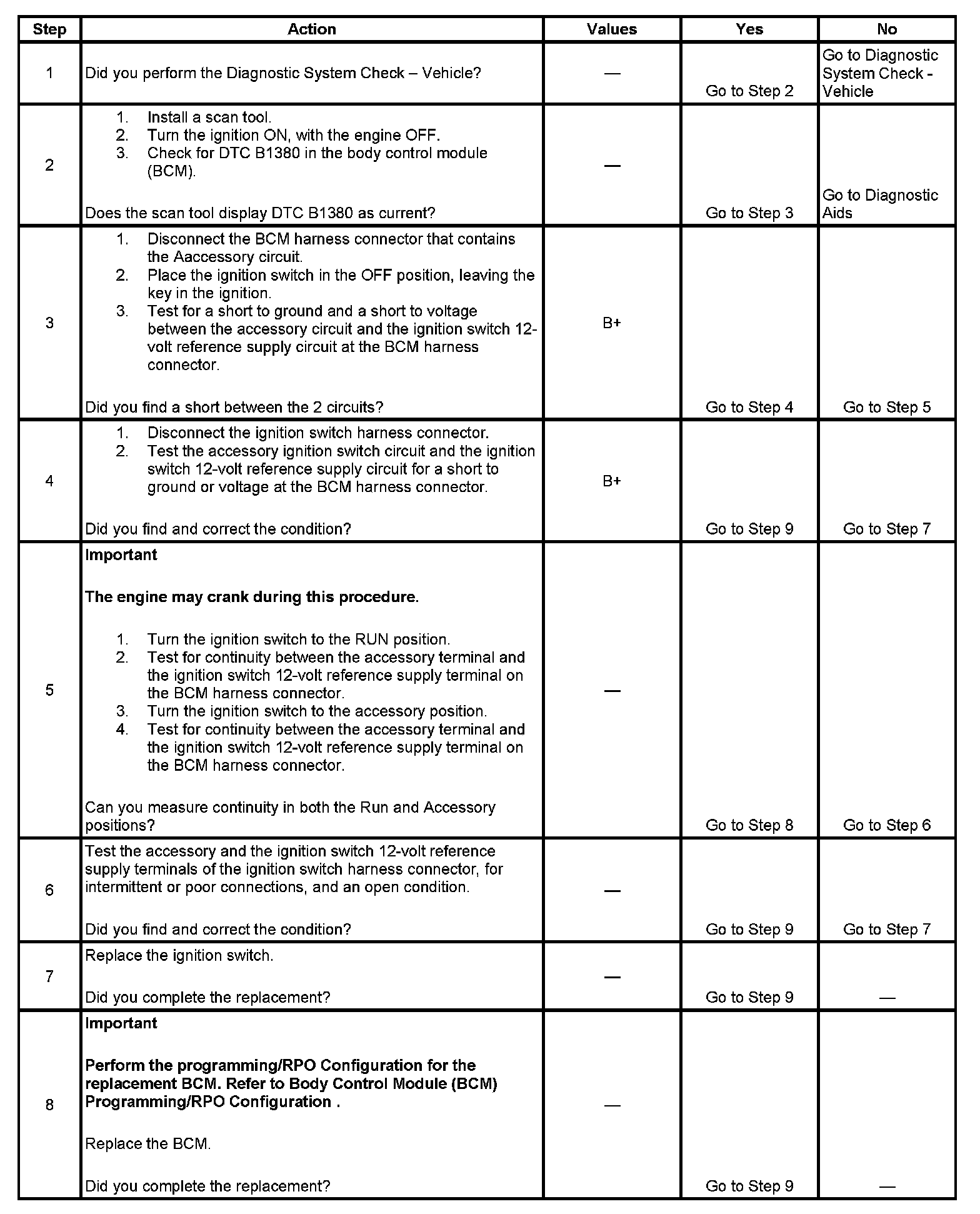 The body control module (BCM) monitors the ACCESSORY signal from the ignition switch. When the vehicle operator places the ignition switch in the Accessory or Run position, the switch supplies B+ to the BCM ACCESSORY input terminal. If this circuit becomes shorted to B+, ground or the circuit opens, DTC B1380 will set.