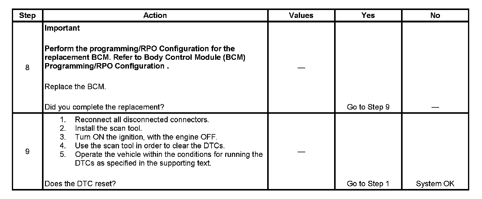 The numbers below refer to the step numbers on the diagnostic table.