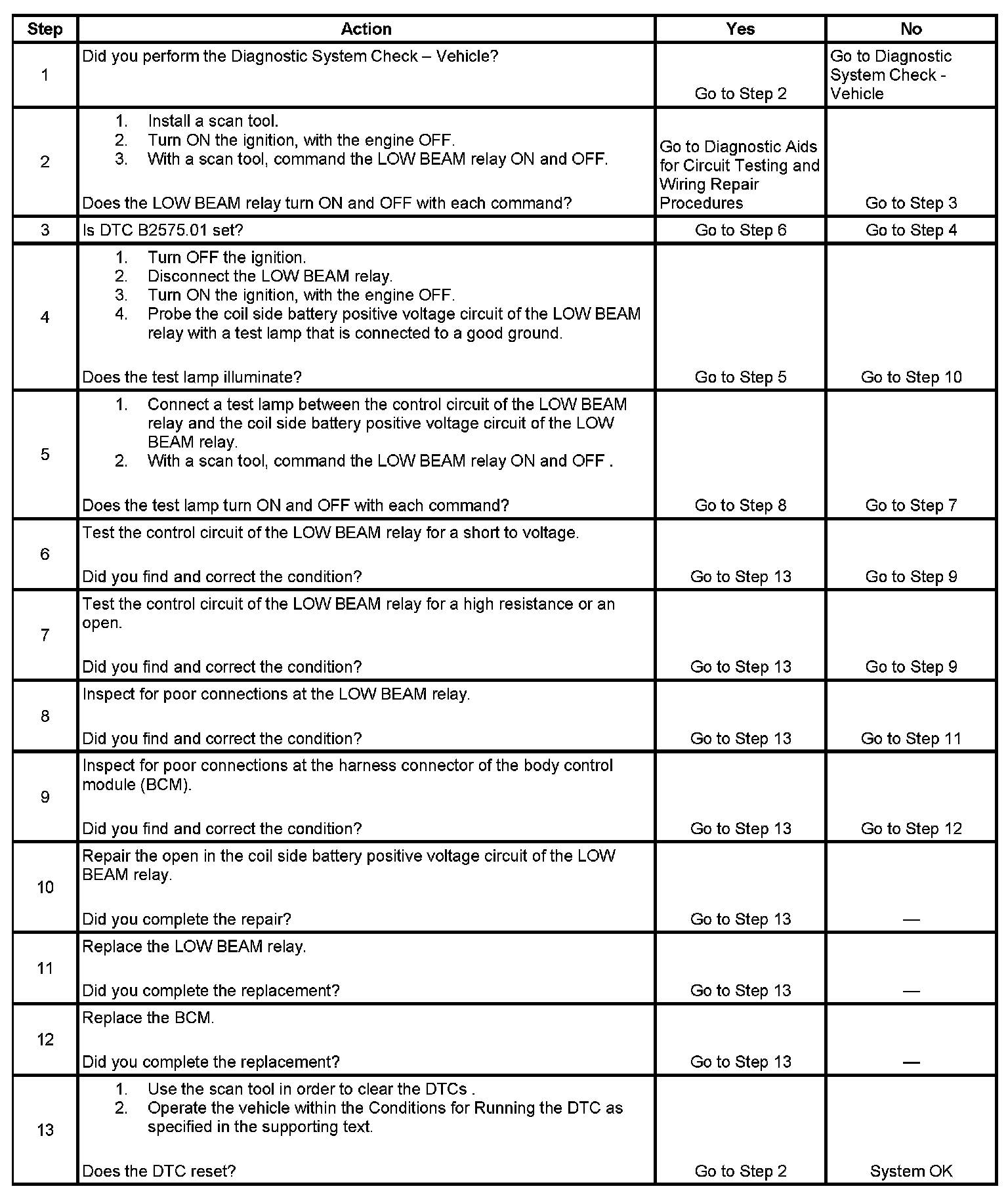 - B2575.06 will set if there is an open or short to ground in the low beam relay control circuit.