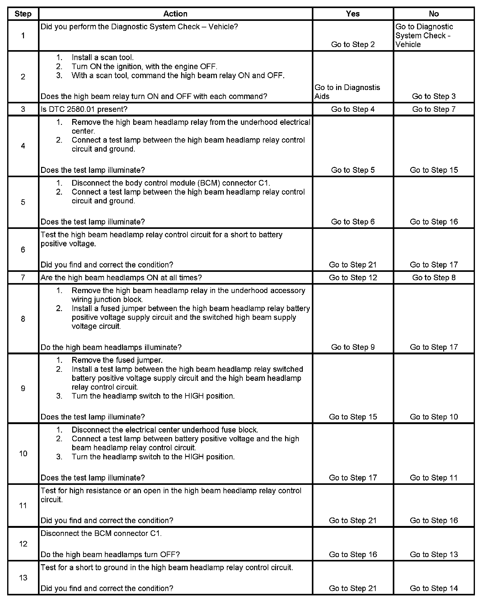 DTC B2580 Headlamp High Beam Control Circuit