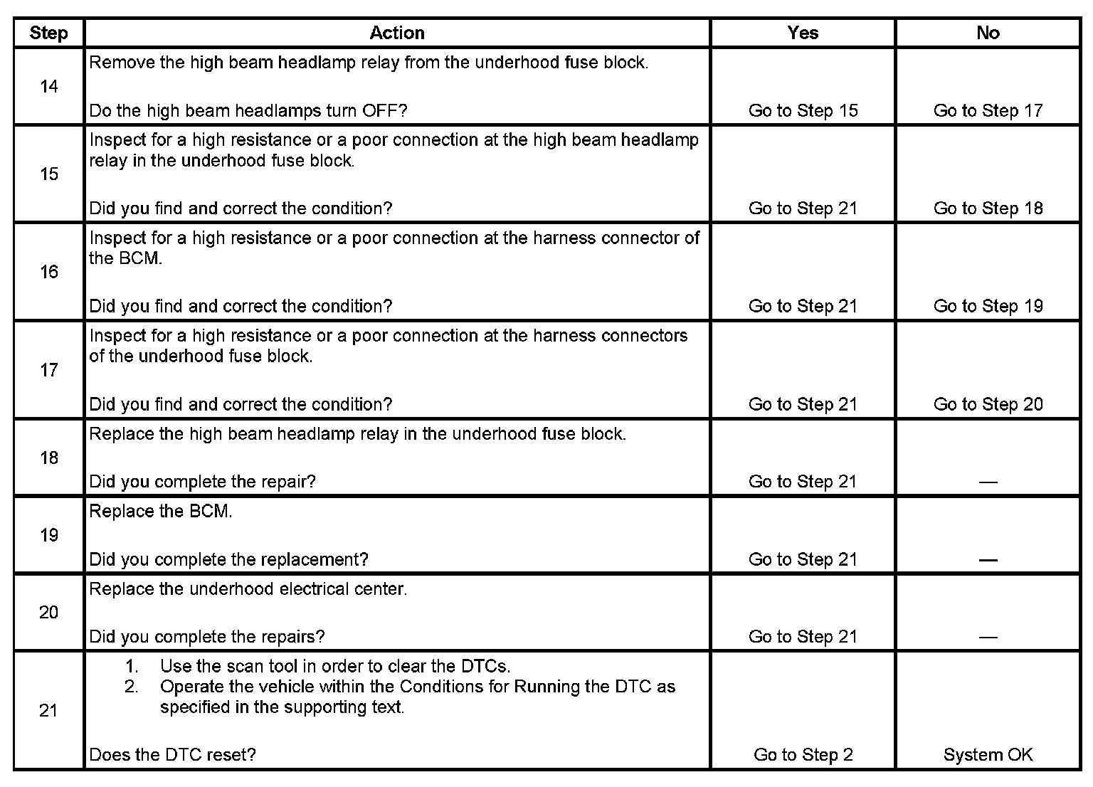 This DTC will set if there is an open or short to ground in the high beam relay control circuit.