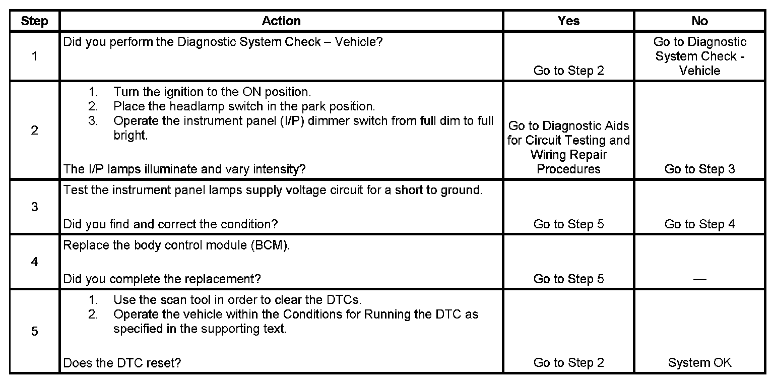 The body control module (BCM) monitors the instrument panel (I/P) lamps dimming control circuit to determine the lighting intensity of the I/P lamps. When the BCM receives a varied voltage signal on the I/P lamps dimming control circuit, it applies a corresponding pulse width modulated (PWM) voltage signal through the I/P lamps supply voltage circuit to all the I/P lamps.