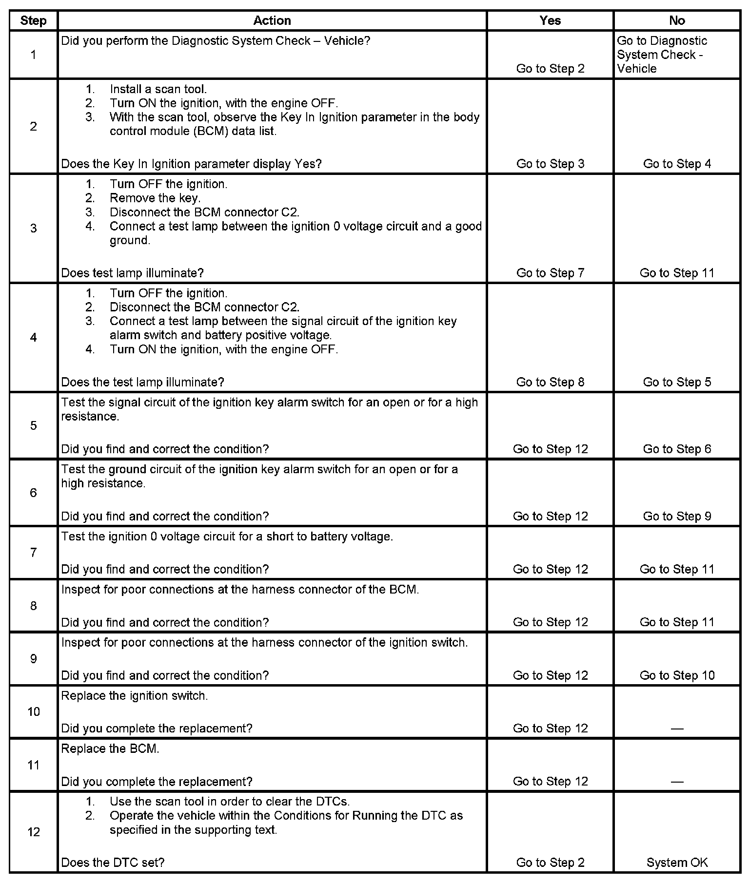 The body control module (BCM) monitors the ignition key alarm switch. When the key is in the ignition, the ignition key alarm switch is closed and the signal circuit is low. When the key is not in the ignition, the ignition key alarm switch is open and the signal circuit is high.