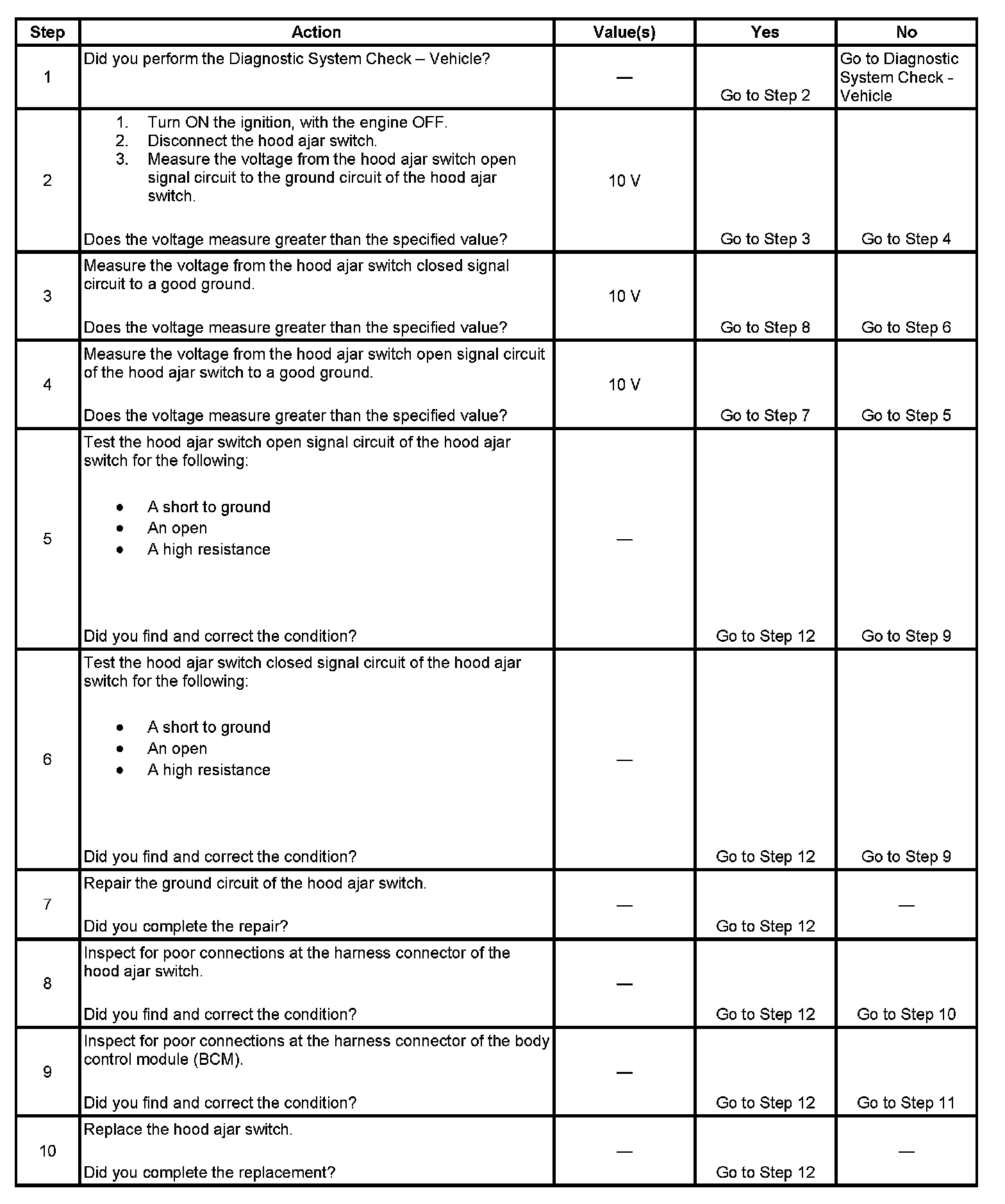 The body control module (BCM) monitors the voltage input of the hood ajar switch open signal circuit and the hood ajar switch closed signal circuit. The 2 separate voltage signals should never be the same voltage with the hood opened or closed. If the 2 voltage signal should have the same voltage value DTC B3006 will set.
