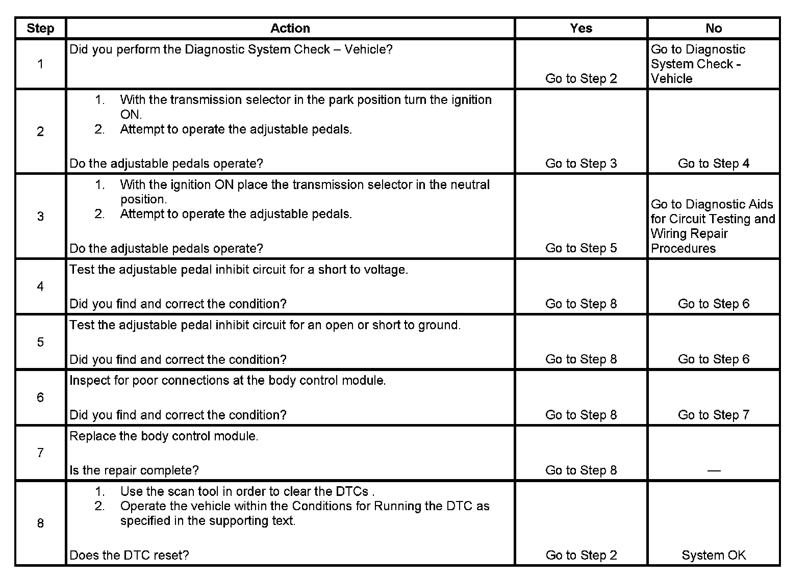 The adjustable pedal system will be disabled by the adjustable pedal module anytime the transmission selector lever is not in the park position while the ignition is on. This feature is controlled by the body control module (BCM) through the adjustable pedal inhibit circuit. While the system is being disabled the BCM supplies battery voltage to the adjustable pedal module through the adjustable pedal inhibit circuit. When the adjustable pedal system is enabled by the body control module the adjustable pedal inhibit circuit will be at 0 volts.