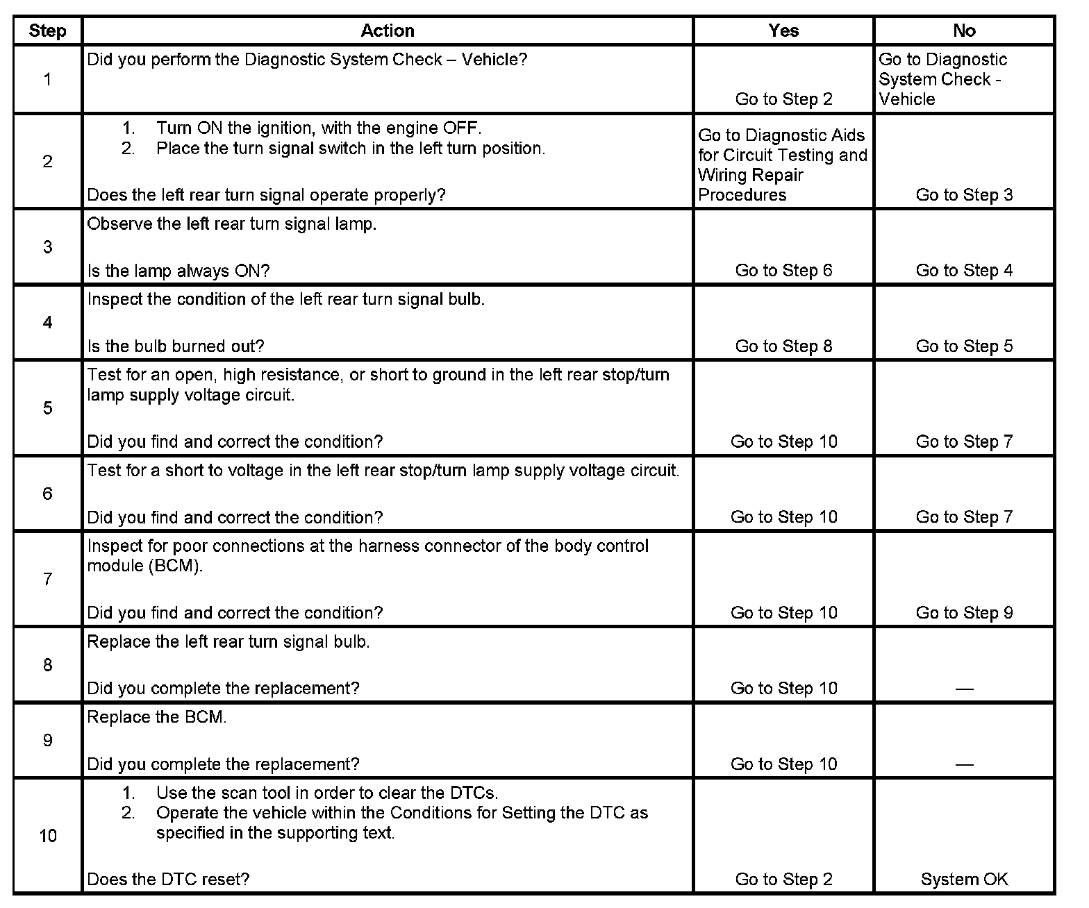 The body control module (BCM) controls the left rear turn signal and hazard lamp. The BCM supplies voltage to control the lighting functions. The BCM monitors the left rear stop/turn lamp supply voltage circuit for proper operation.
