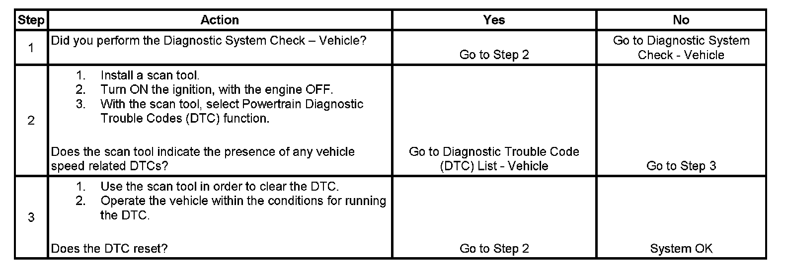 2. This step tests for the presence of vehicle speed related DTCs in the control module where the vehicle speed message originates.