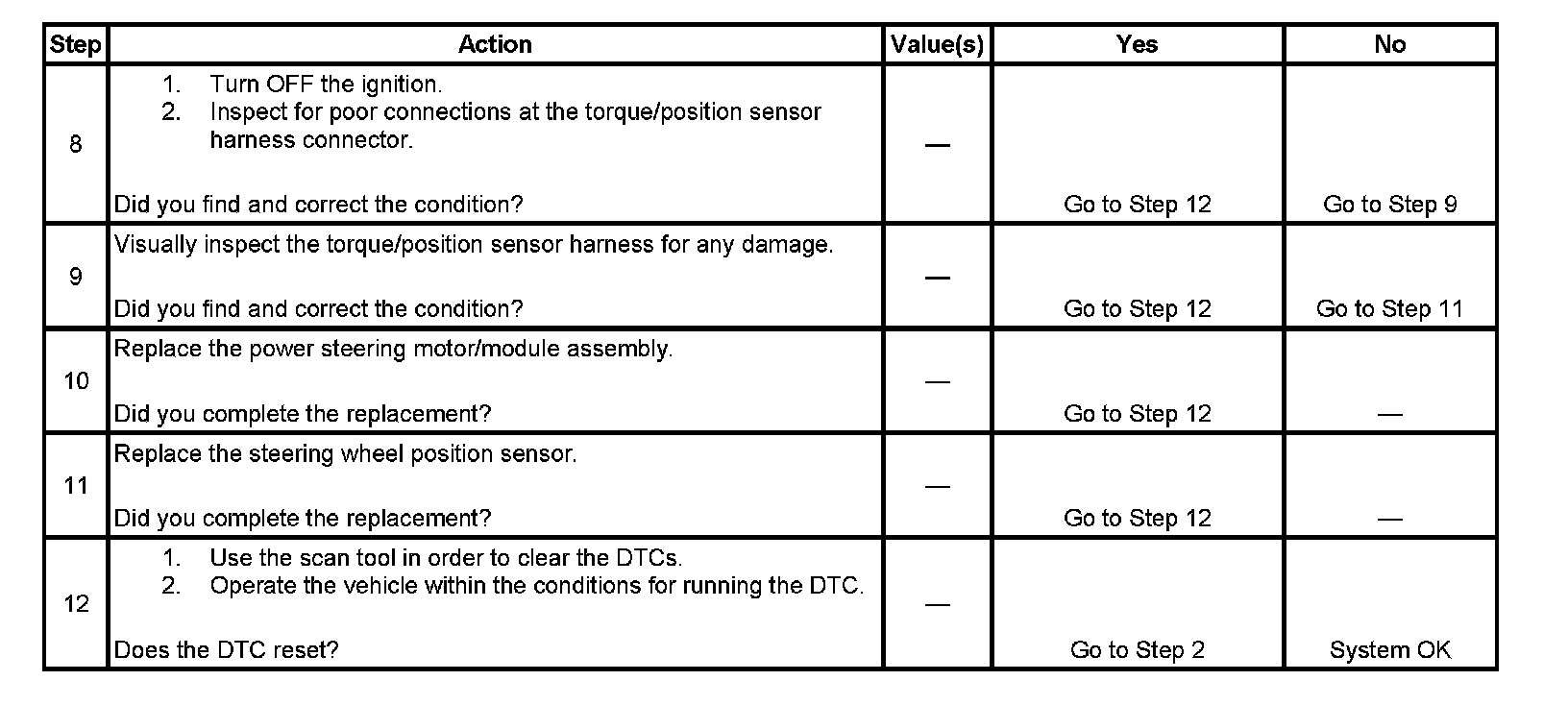 9. This step tests if the torque/position sensor harness is damaged. Since both ends of the harness can not be accessed, only visual circuit inspection can be performed.