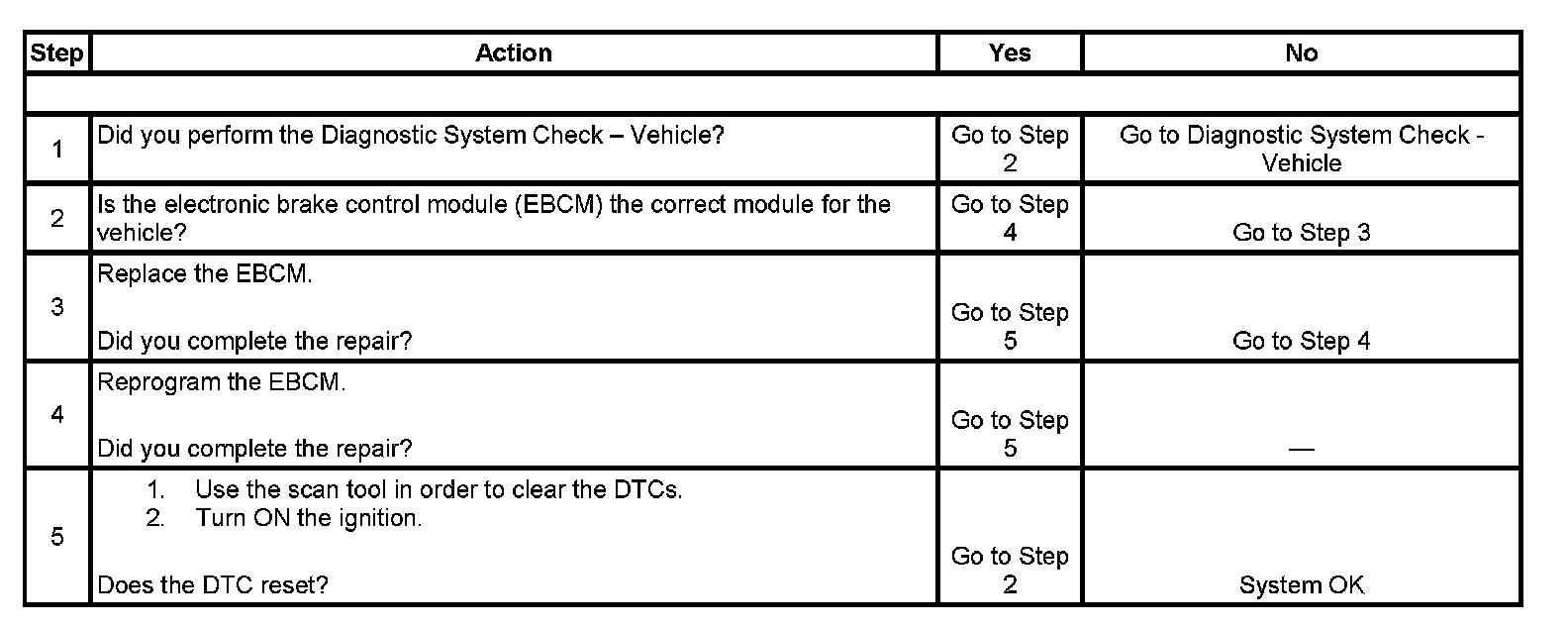 If the DTC was set after EBCM replacement, verify that the replacement EBCM and software are correct for the vehicle.