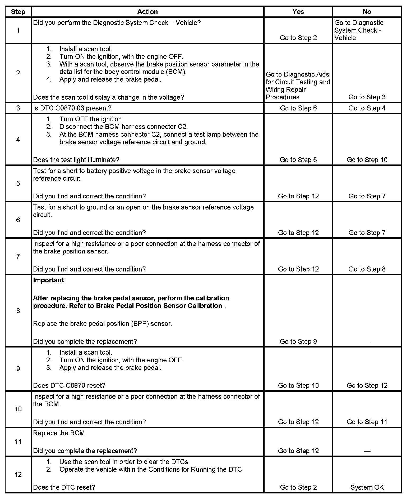 The body control module (BCM) applies a ground through the brake sensor reference low circuit to the brake pedal position (BPP) sensor. The BCM supplies a 5-volt reference through the brake sensor reference voltage circuit to the brake position sensor. When the brake pedal is being applied, the BPP sensor then sends a variable voltage signal through the brake sensor signal circuit to the BCM.