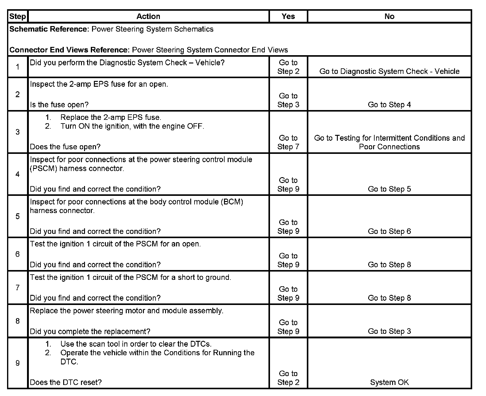 The power steering control module (PSCM) receives a power mode message from the body control module (BCM) via the serial data circuit. When a power mode ON message is received, the PSCM compares it to the state of its ignition 1 voltage circuit.