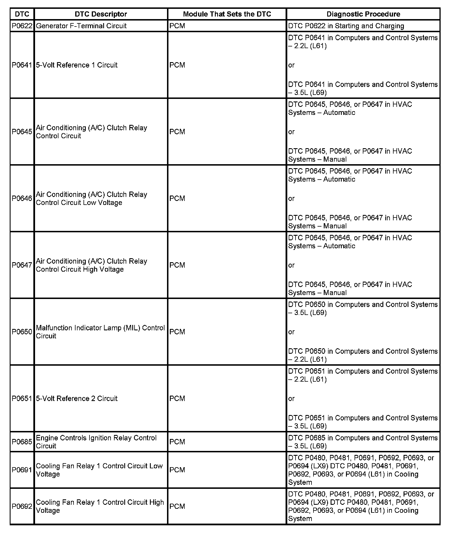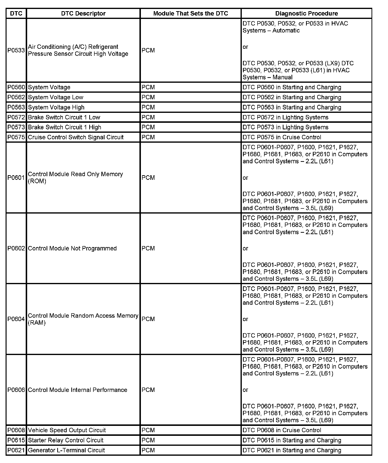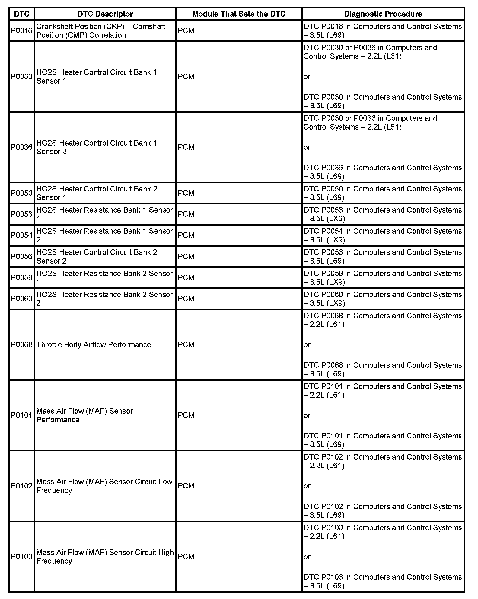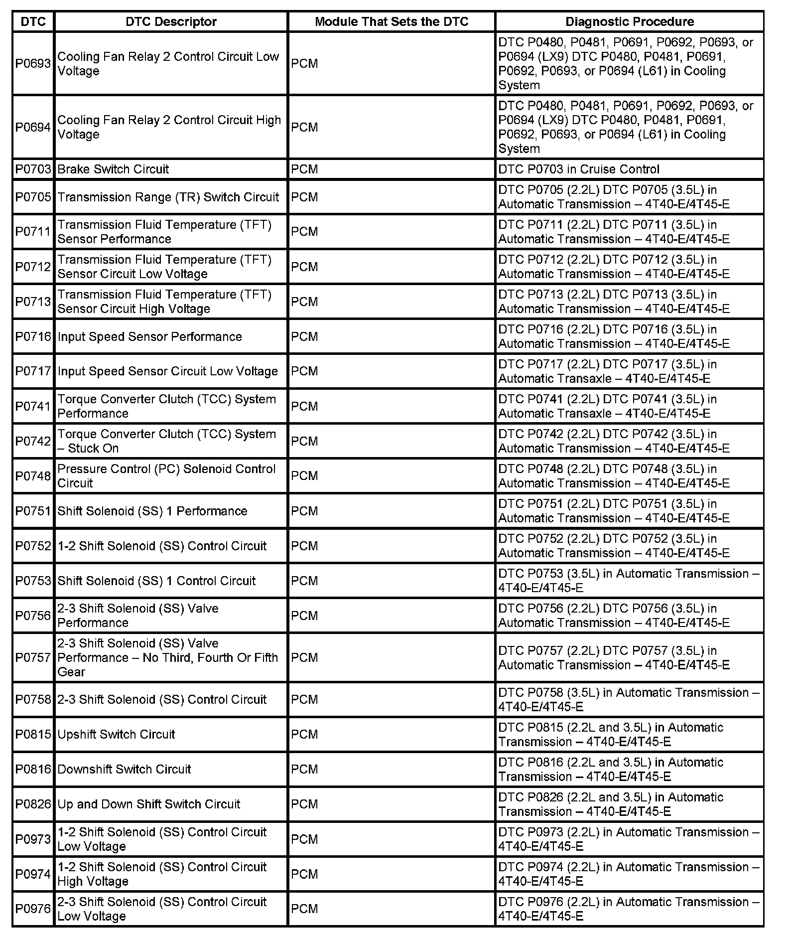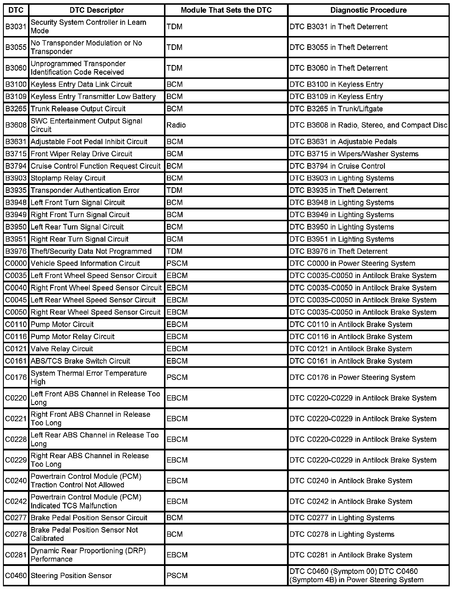 This master DTC list includes all applicable DTCs in alphanumeric order with descriptors.
