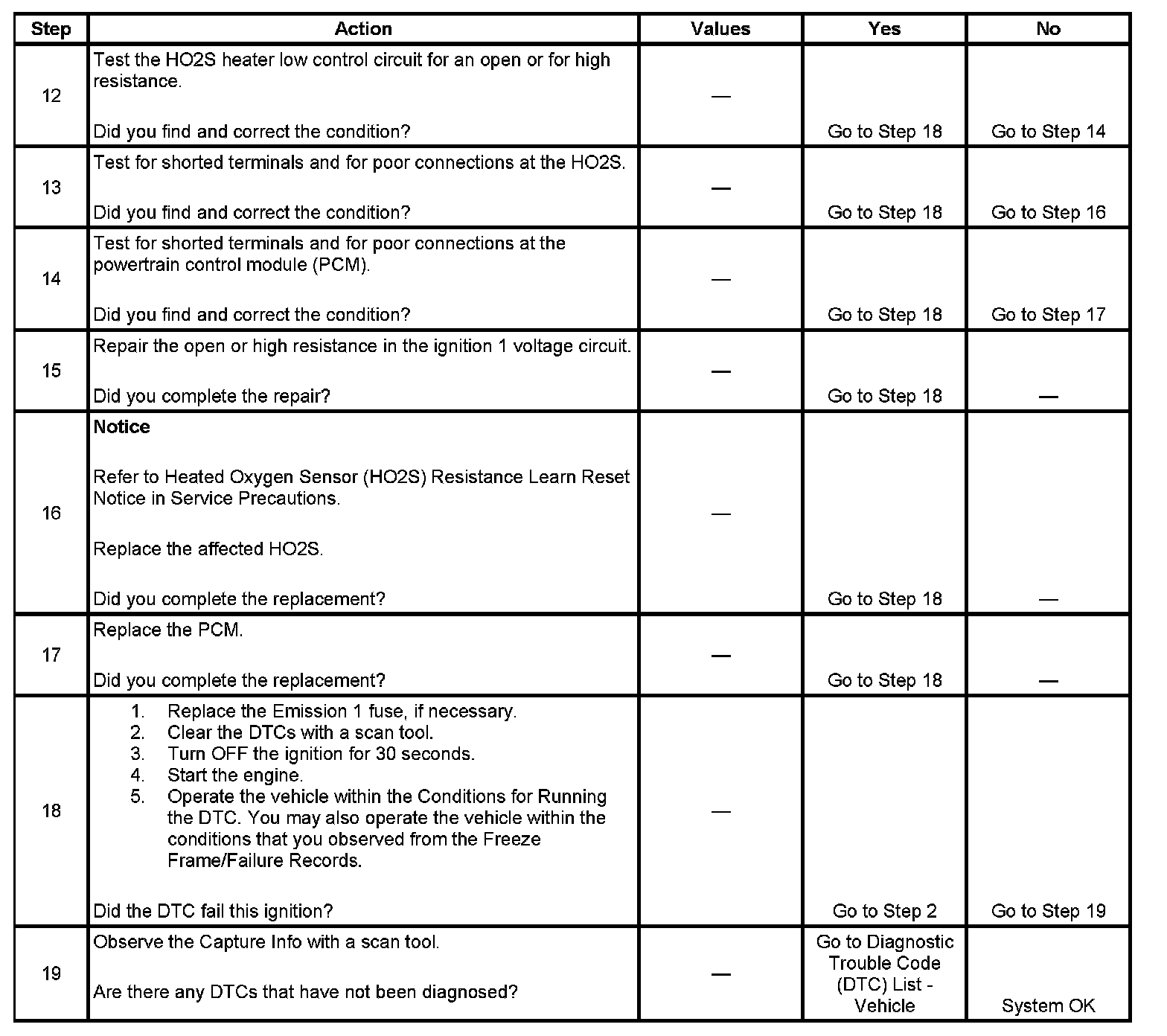 Heated oxygen sensors (HO2S) are used for fuel control and post catalyst monitoring. Each HO2S compares the oxygen content of the surrounding air with the oxygen content in the exhaust stream. The HO2S must reach operating temperature to provide an accurate voltage signal. A heating element inside the HO2S minimizes the time required for the sensor to reach operating temperature. Voltage is provided to the heater by the ignition 1 voltage circuit through a fuse. With the engine running, ground is provided to the heater by the HO2S heater low control circuit, through a low side driver within the powertrain control module (PCM).