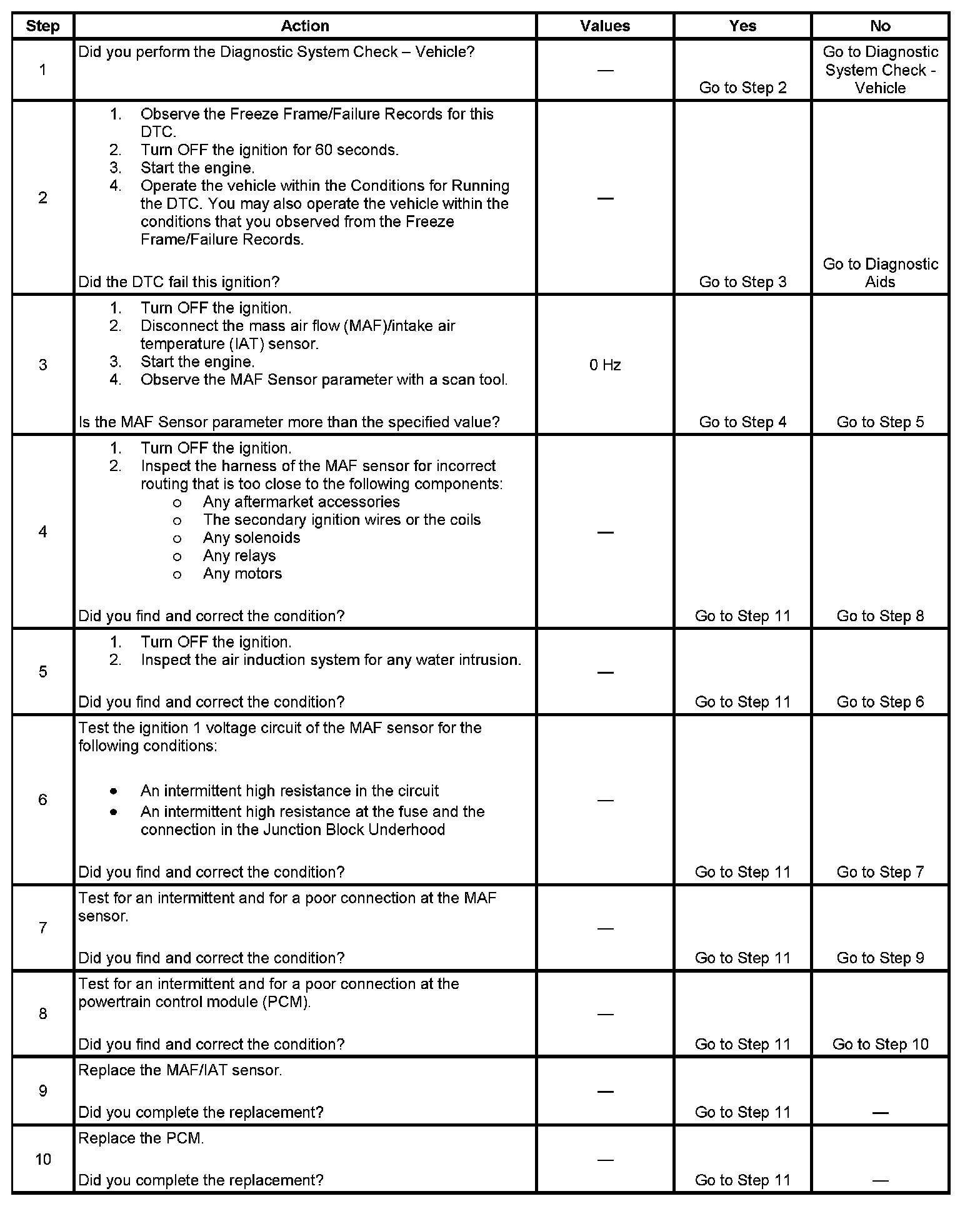 3. This step tests for Electromagnetic Interference (EMI) on the signal circuit of the MAF sensor. A frequency reading with the MAF sensor disconnected may indicate an EMI related fault or a poor connection at the PCM. Disconnecting the MAF sensor may set additional related DTCs.