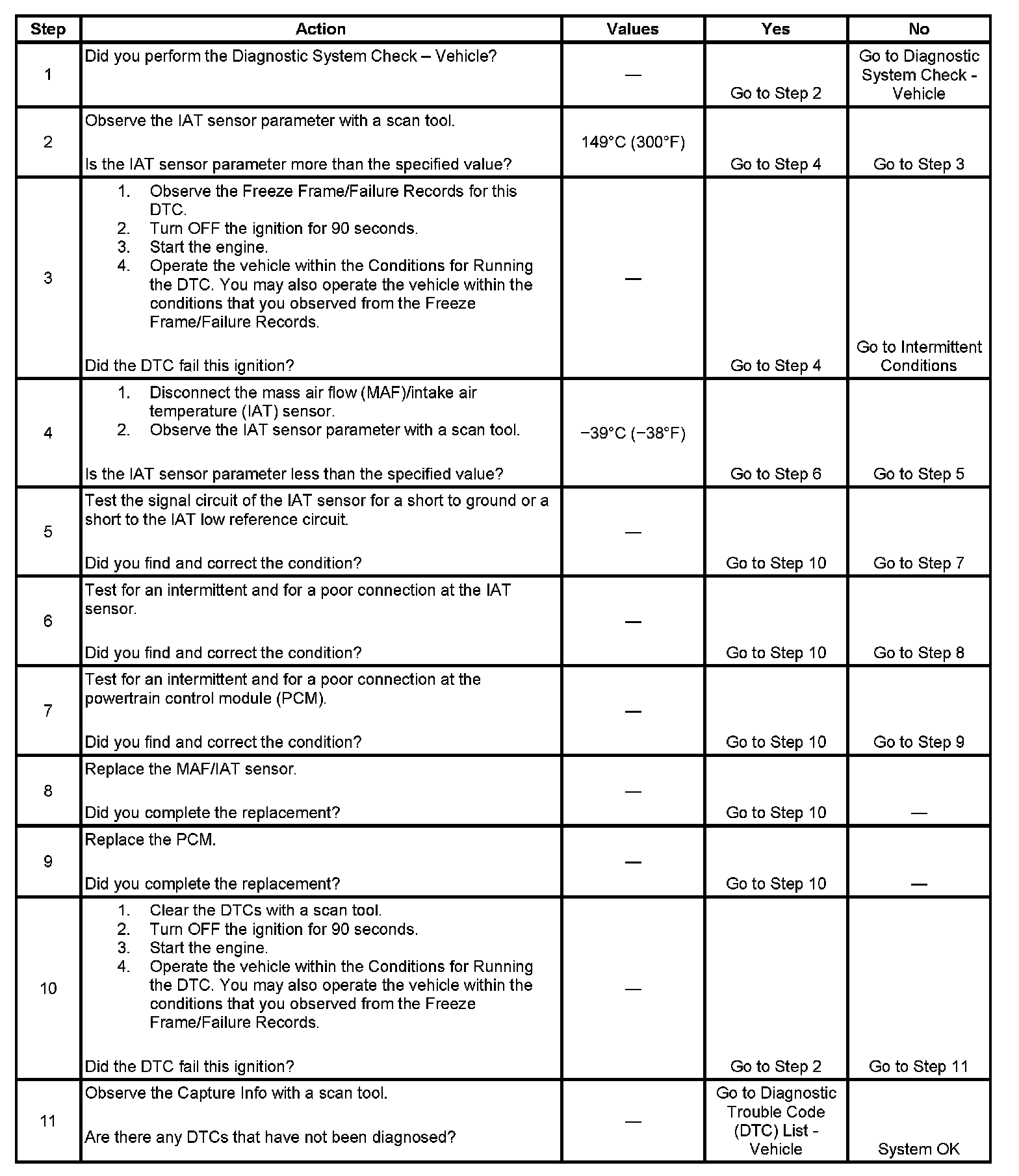 The PCM detects that the IAT sensor parameter is more than 149°C (300°F) for more than 5 seconds.