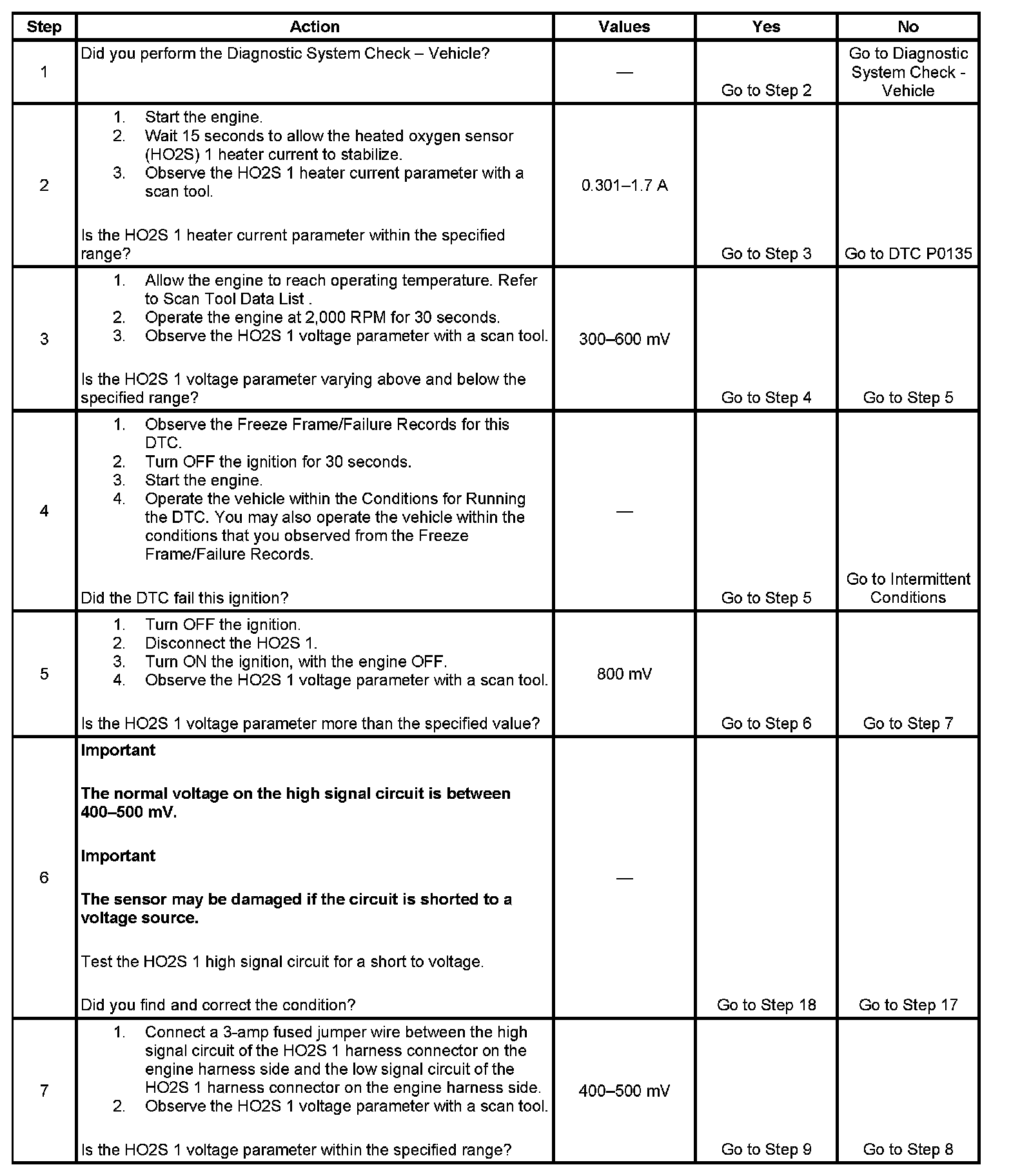 The numbers below refer to the step numbers on the diagnostic table.