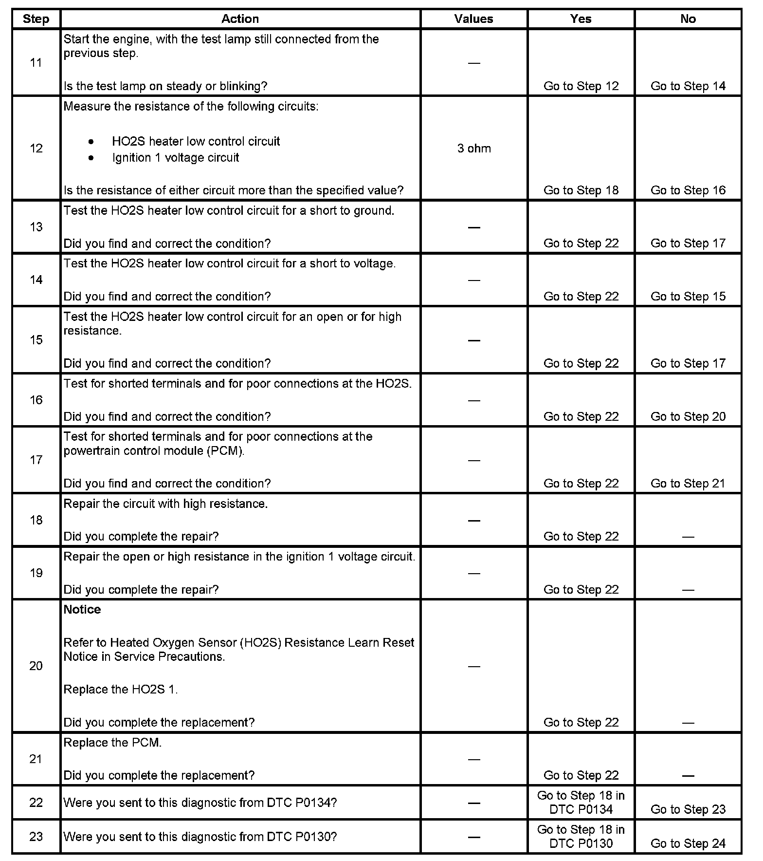 - The PCM detects that the HO2S 1 heater calculated resistance is not within the expected range at engine start-up.