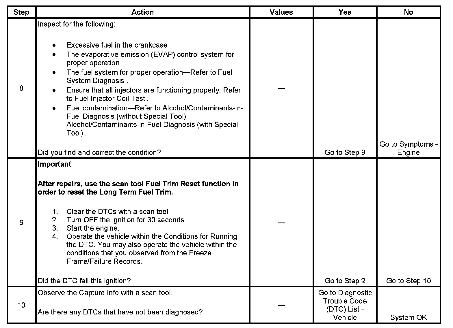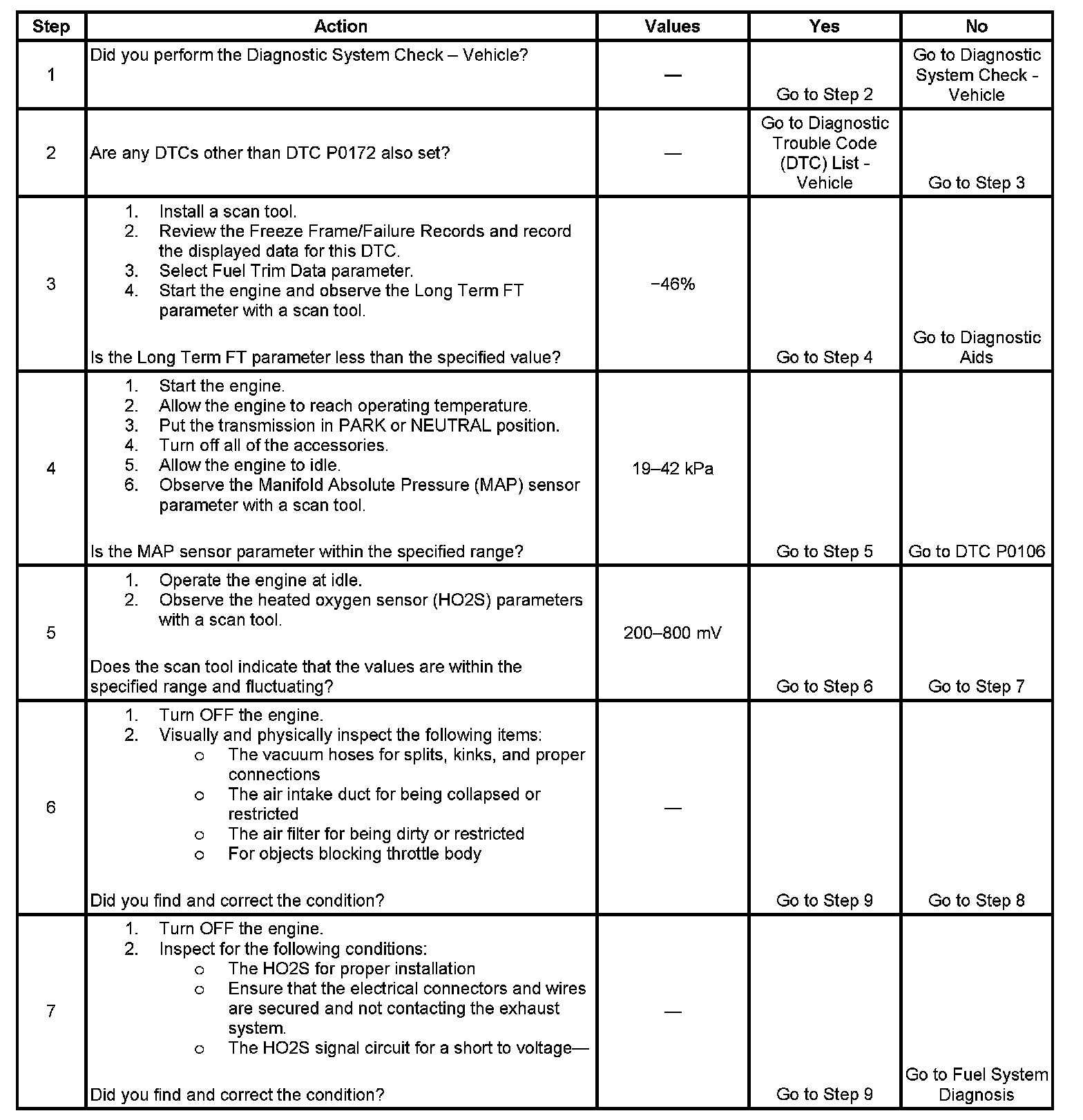 The powertrain control module (PCM) controls the air/fuel metering system in order to provide the best possible combination of driveability, fuel economy, and emission control. Fuel delivery is controlled differently during Open Loop and Closed Loop (CL). During Open Loop, the PCM determines fuel delivery based on sensor signals, without heated oxygen sensor (HO2S) input. During CL, the PCM adds HO2S inputs and level of purge to calculate the short and long term fuel trim (FT) adjustments. If the HO2S indicate a lean condition, the FT values will be above 0 percent. If the HO2S indicate a rich condition, the FT values will be below 0 percent. The short term FT values change rapidly in response to the HO2S voltage signals. The long term FT makes coarse adjustments in order to maintain Air/Fuel Ratio of 14.7:1. The FT diagnostic will conduct a test to determine if a rich failure actually exists or if excessive vapor from the evaporative emission (EVAP) canister is causing a rich condition. A block of cells contain information arranged in combinations of engine RPM and engine load for a full range of vehicle operating conditions. The long term FT diagnostic is based on an average of cells currently being used. The PCM selects the cells based on the engine speed and load. If the PCM detects an excessively rich condition, DTC P0172 sets.