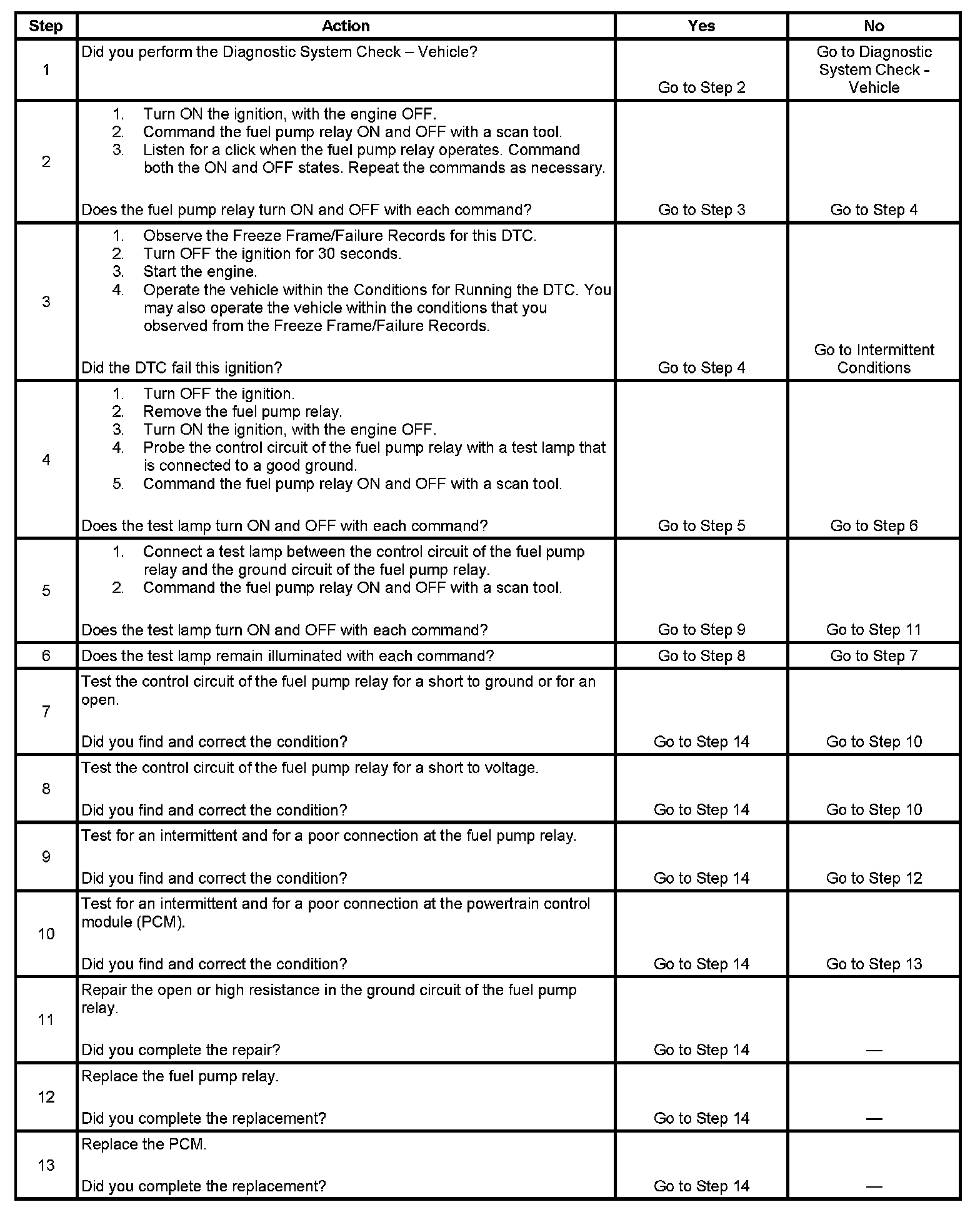 The control module monitors the voltage on the fuel pump relay control circuit. If the control module detects an incorrect voltage on the fuel pump relay control circuit, a fuel pump relay control DTC sets.